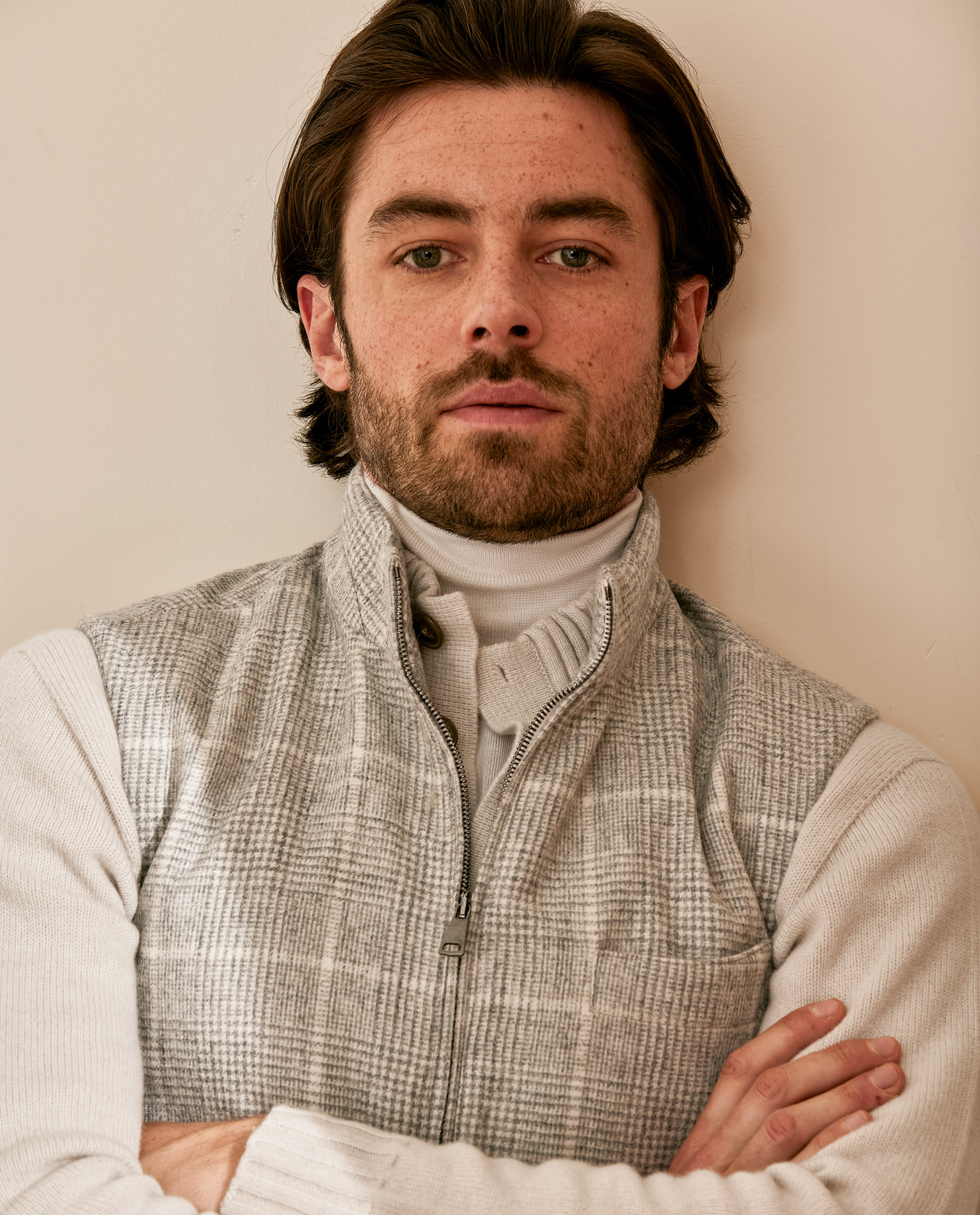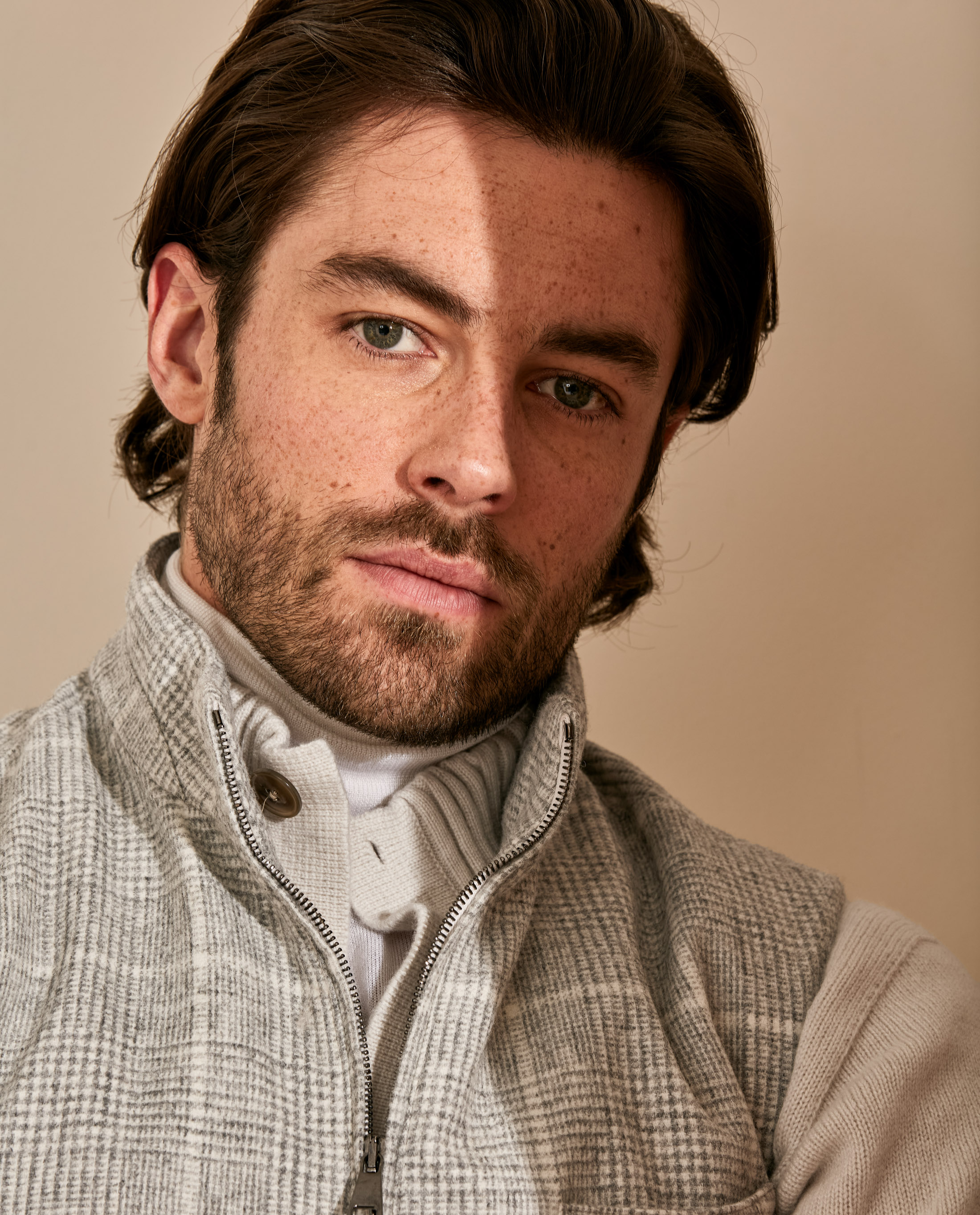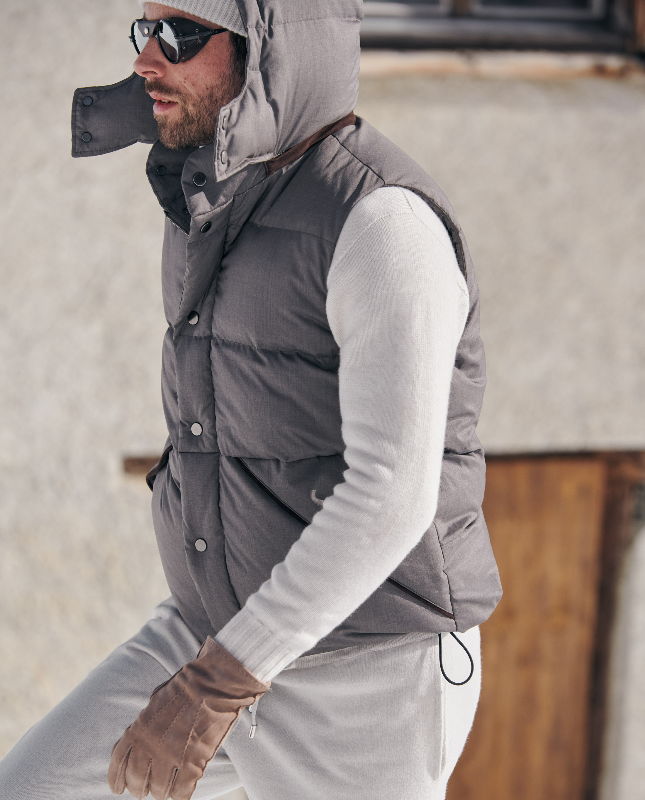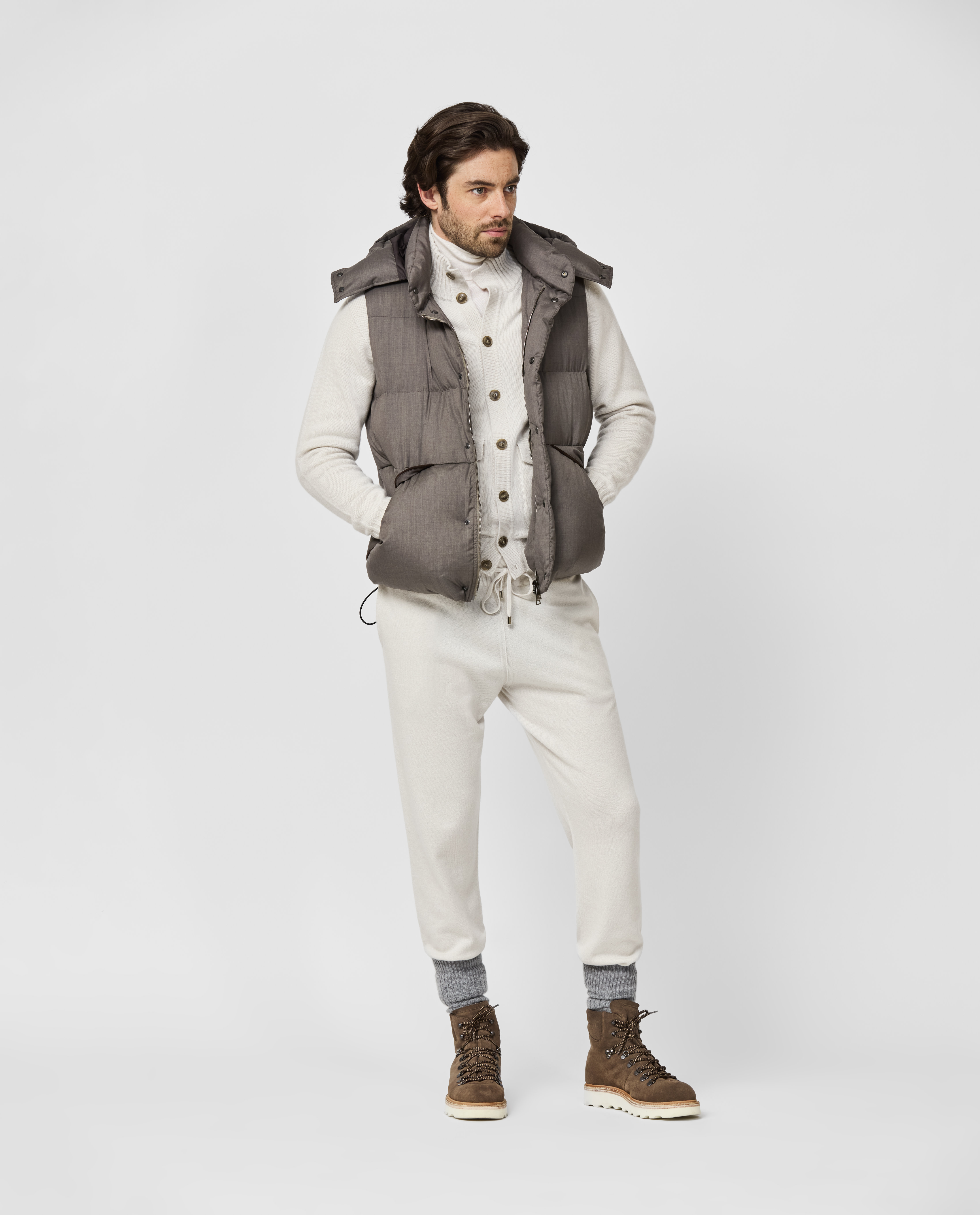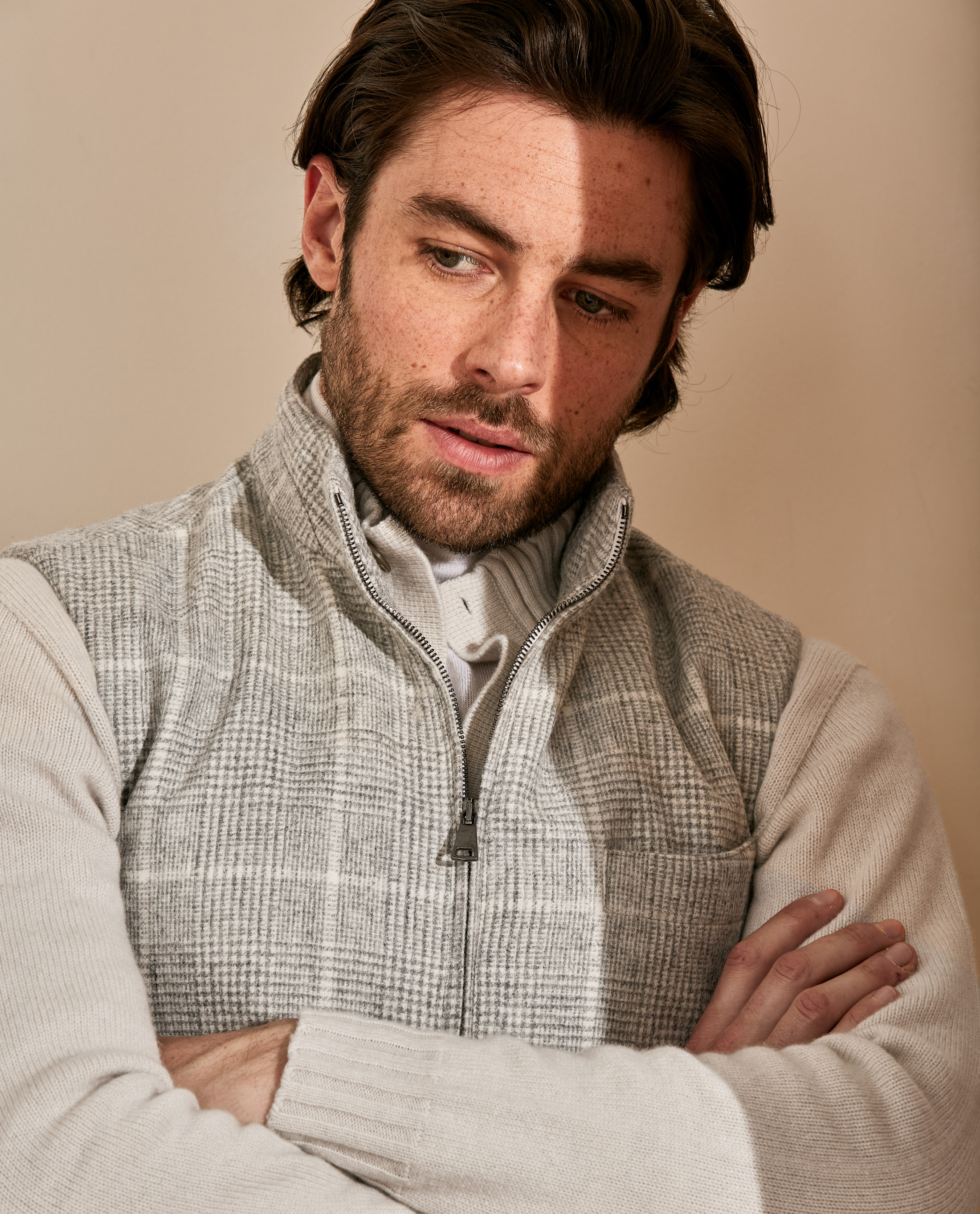 Warm up with your arms free with this light gray plaid vest. Made from a rare blend of ultra-fine baby alpaca, mulesing-free merino wool, and technical fibres. Designed here with a two-way zip for a classic look. Style it with a matching knit, leisure pants, beanie, and scarf to complete the look. Make this vest your own with our many customization options. Baby alpaca & merino wool blend Glen plaid Warm Hypoallergenic Soft feel