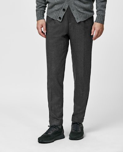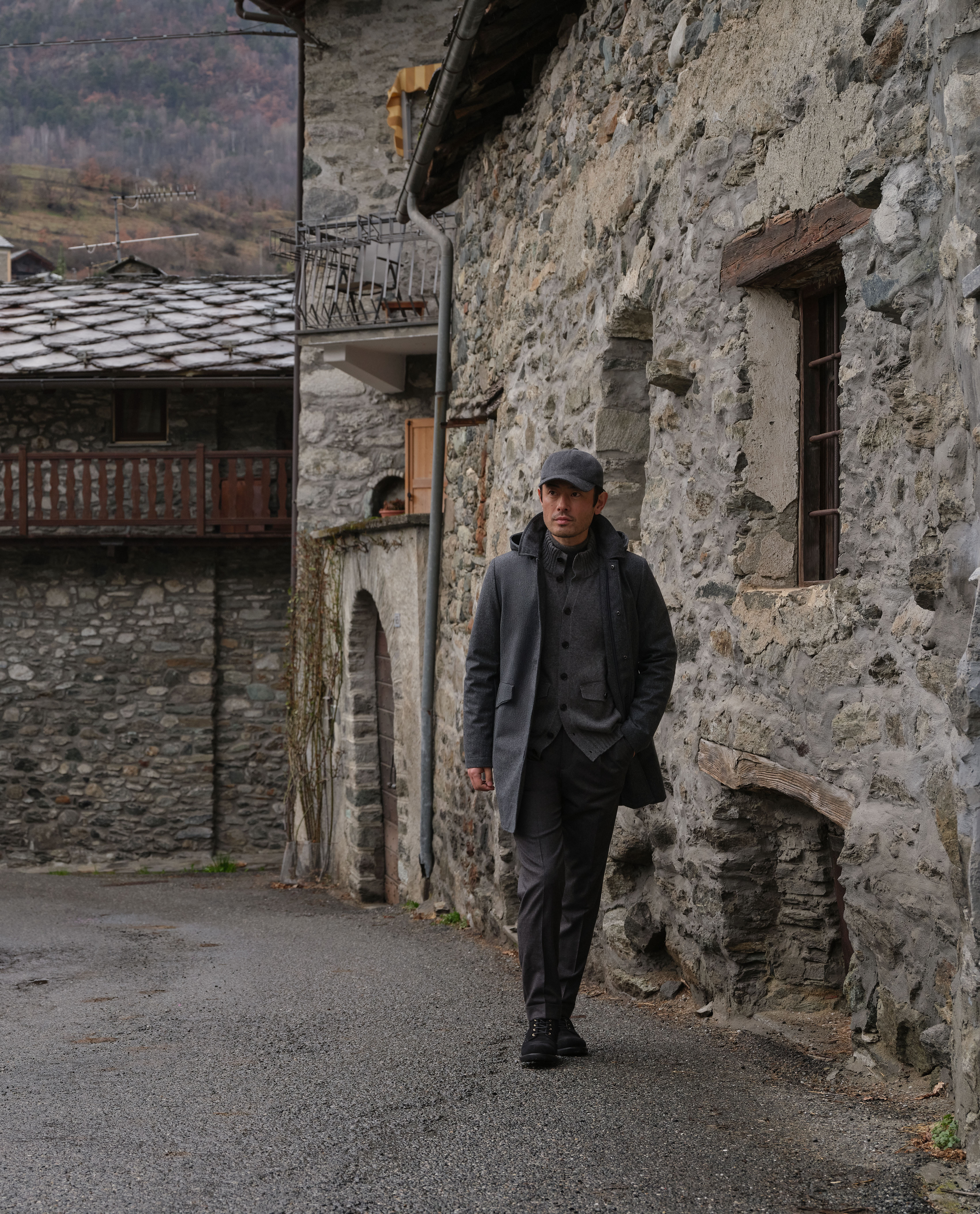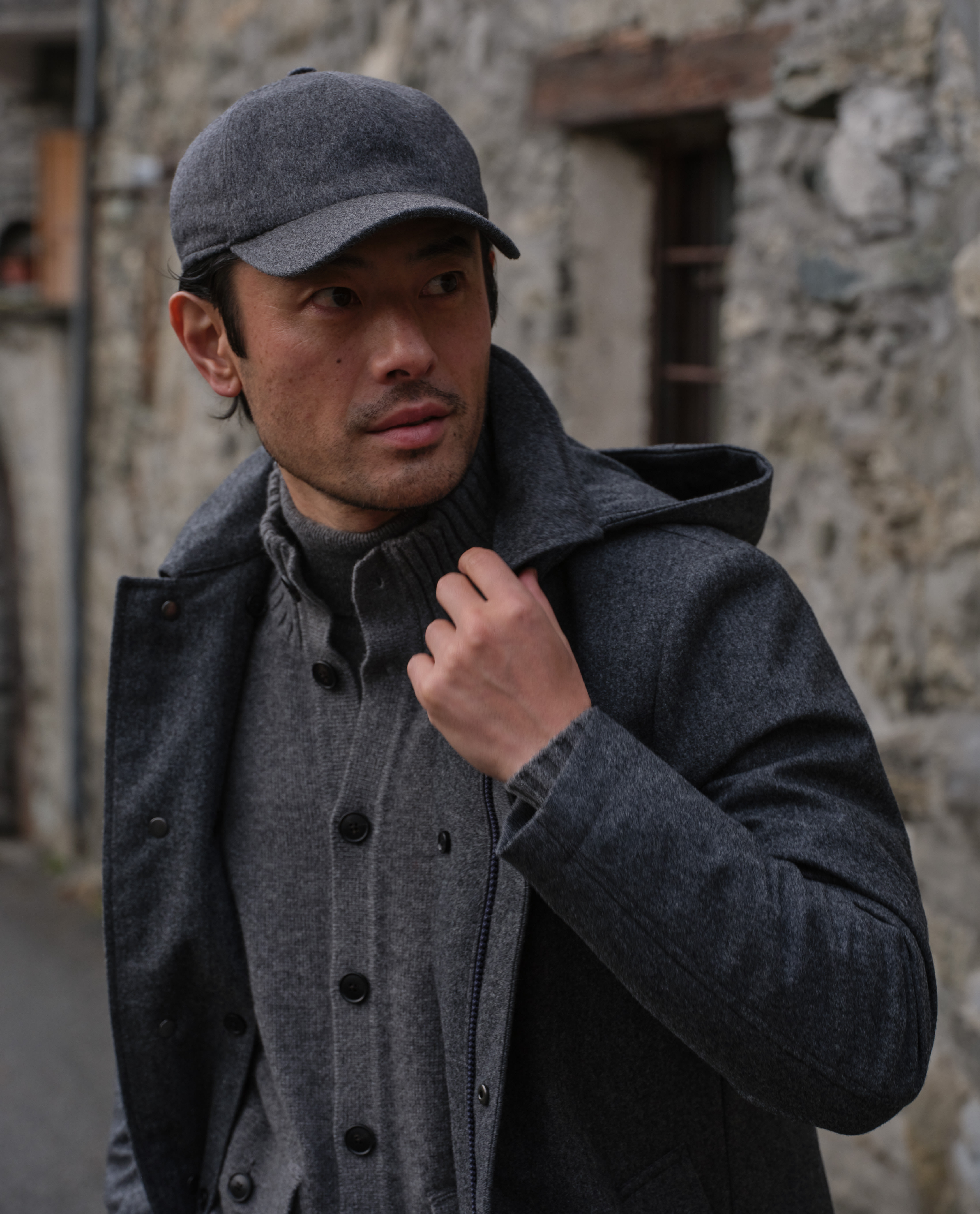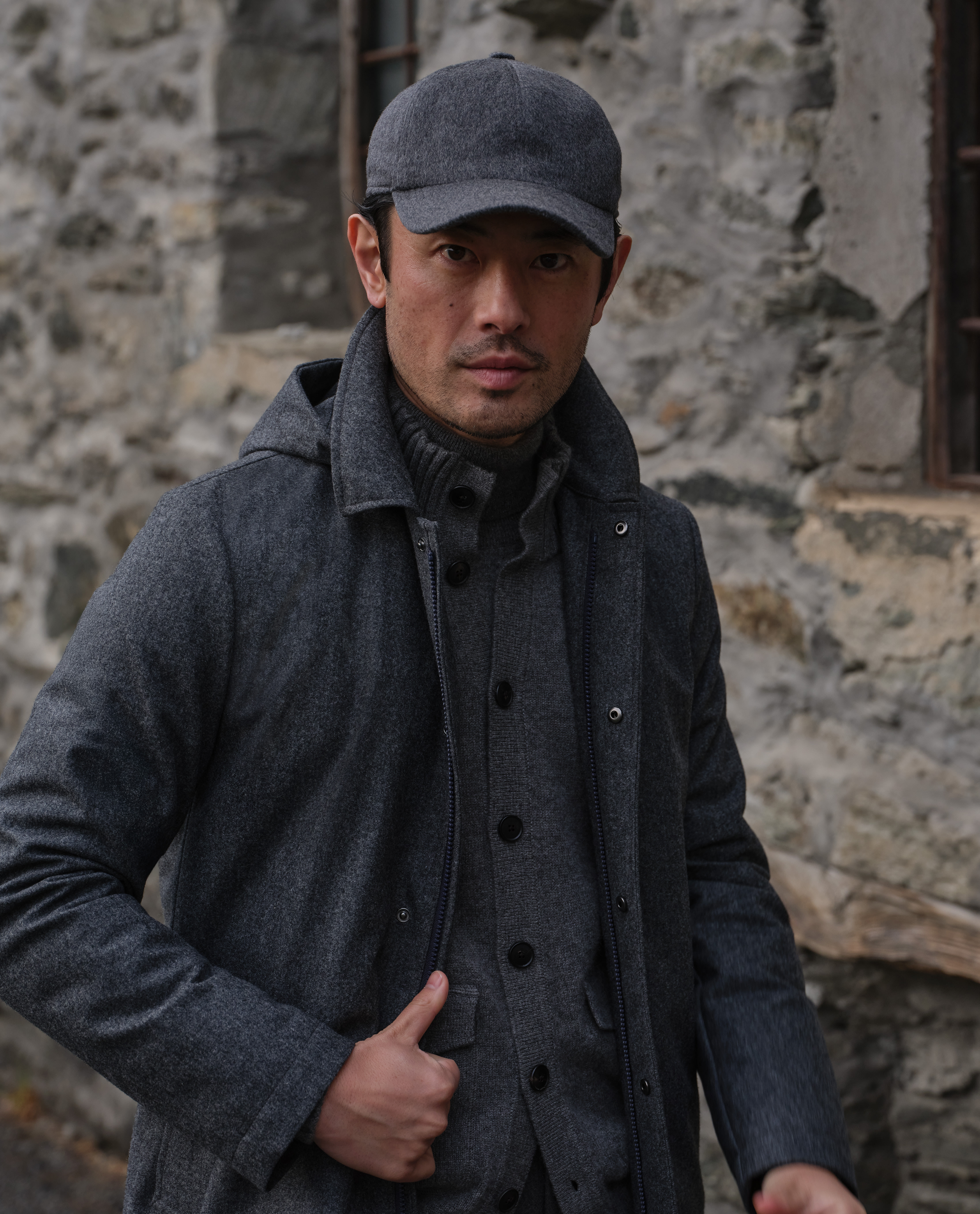 Step into the great outdoors with confidence in this winter ensemble. Anthracite gray trousers combine effortlessly with a heathered gray cashmere turtleneck, a full-button knit, and a weather tech S120 wool coat. Perfect for commuting, travel, and urban adventures.