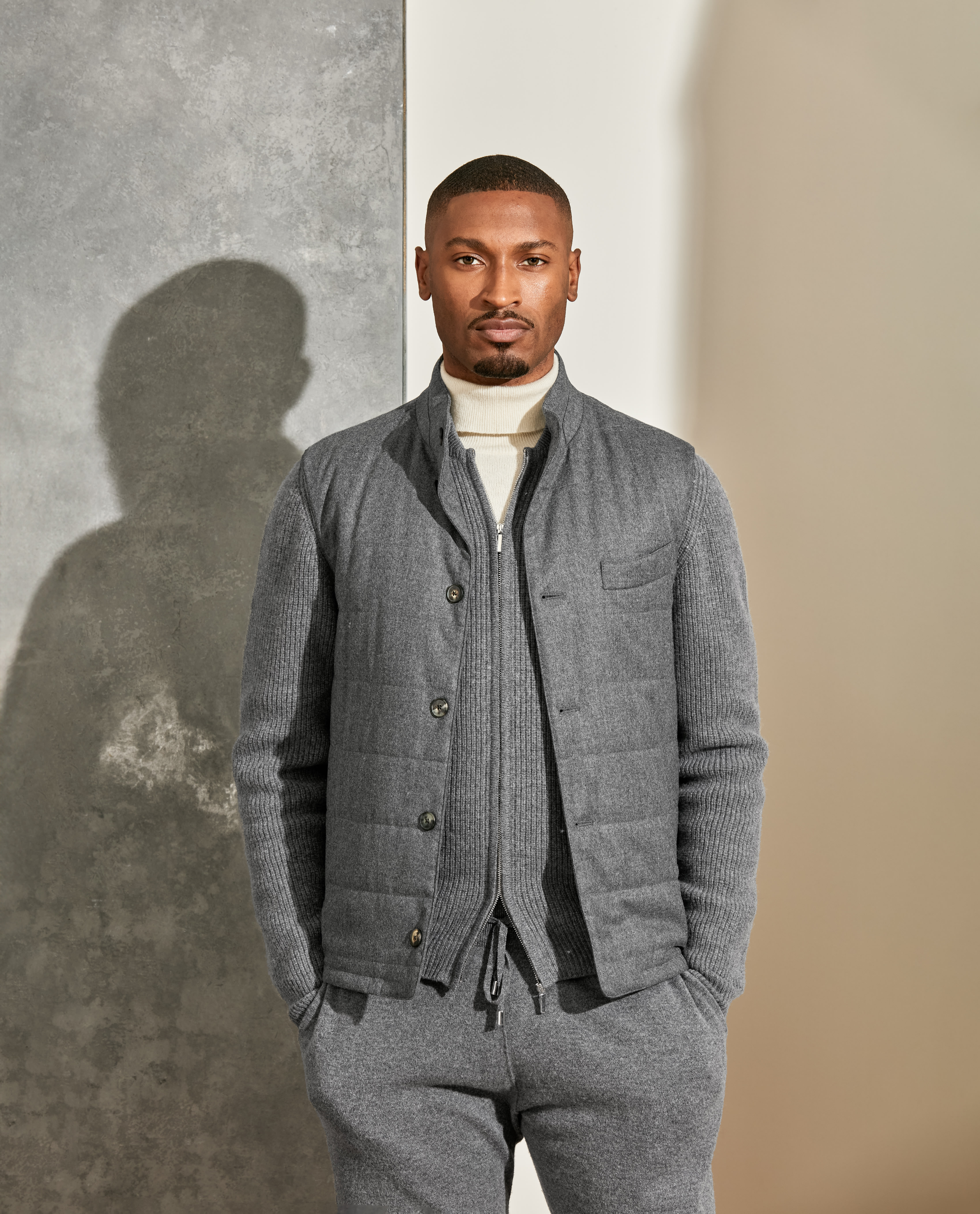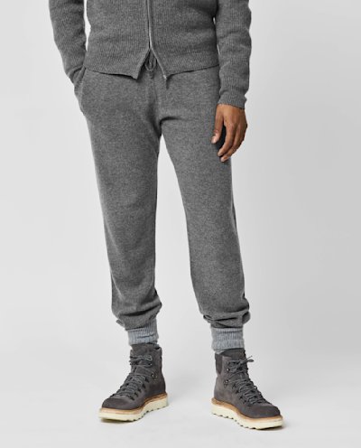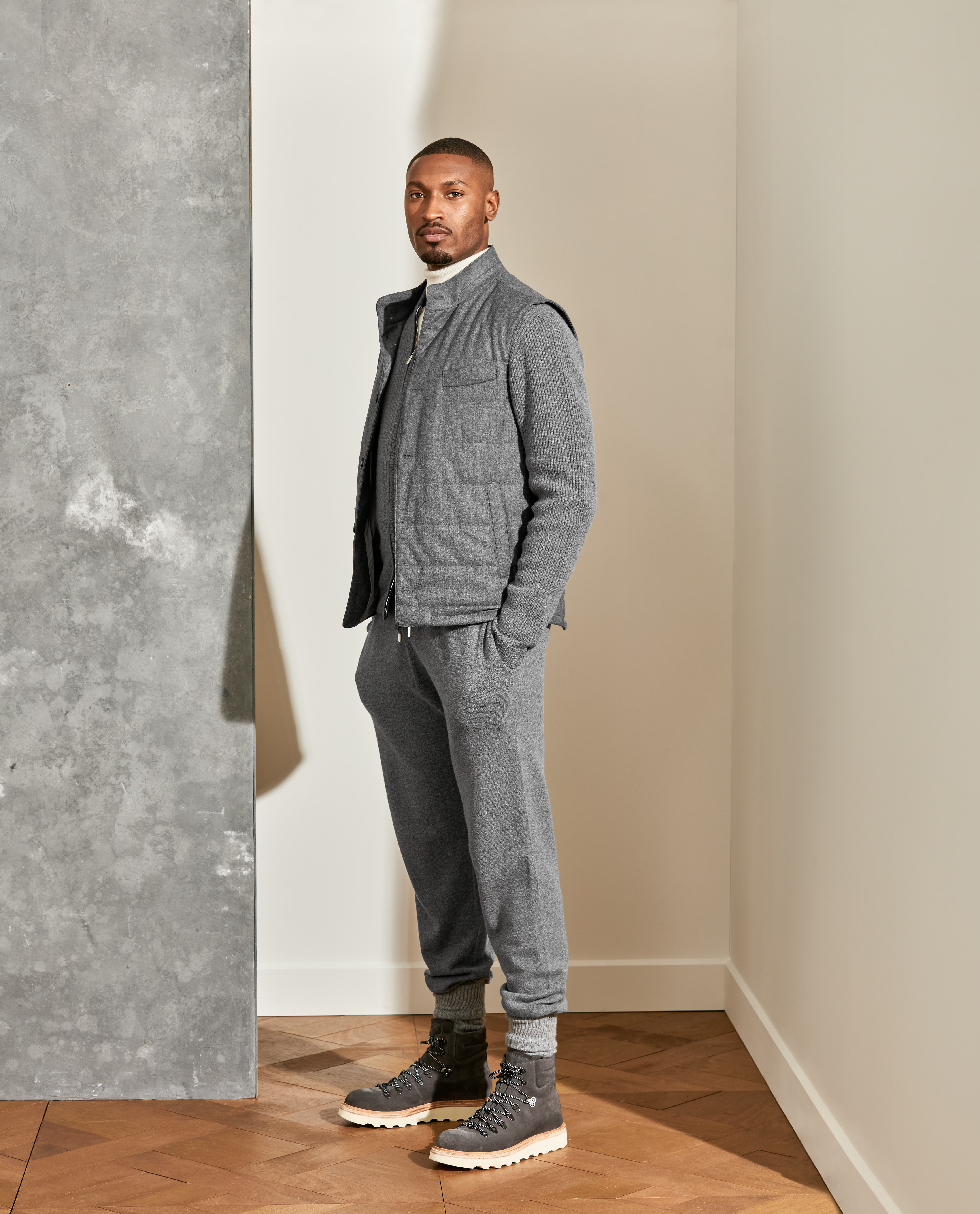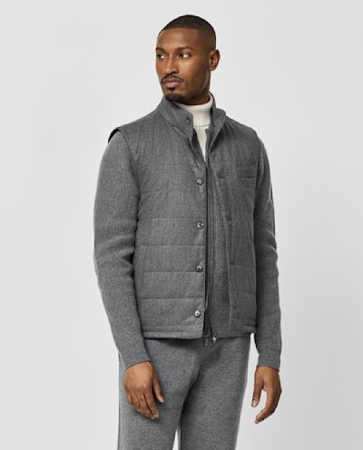 Craving a touch of luxury as you unwind? Opt for this heathered gray quilted vest and wool-cashmere leisure set — easy to adapt to mild or frosty temperatures, whether worn together or as separates. Layered here over a cashmere turtleneck knit with suede mountain boots for a refined look with a rugged edge.