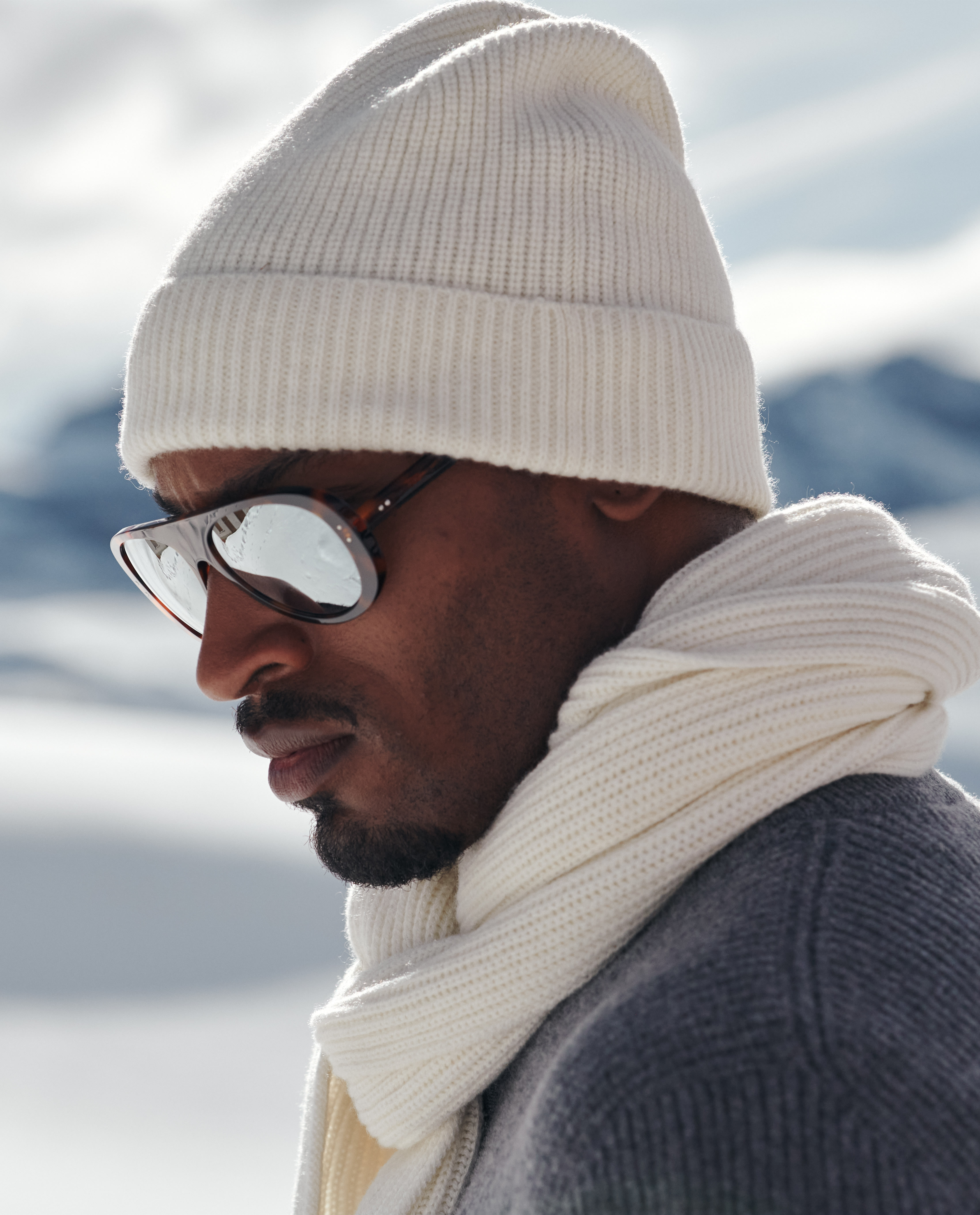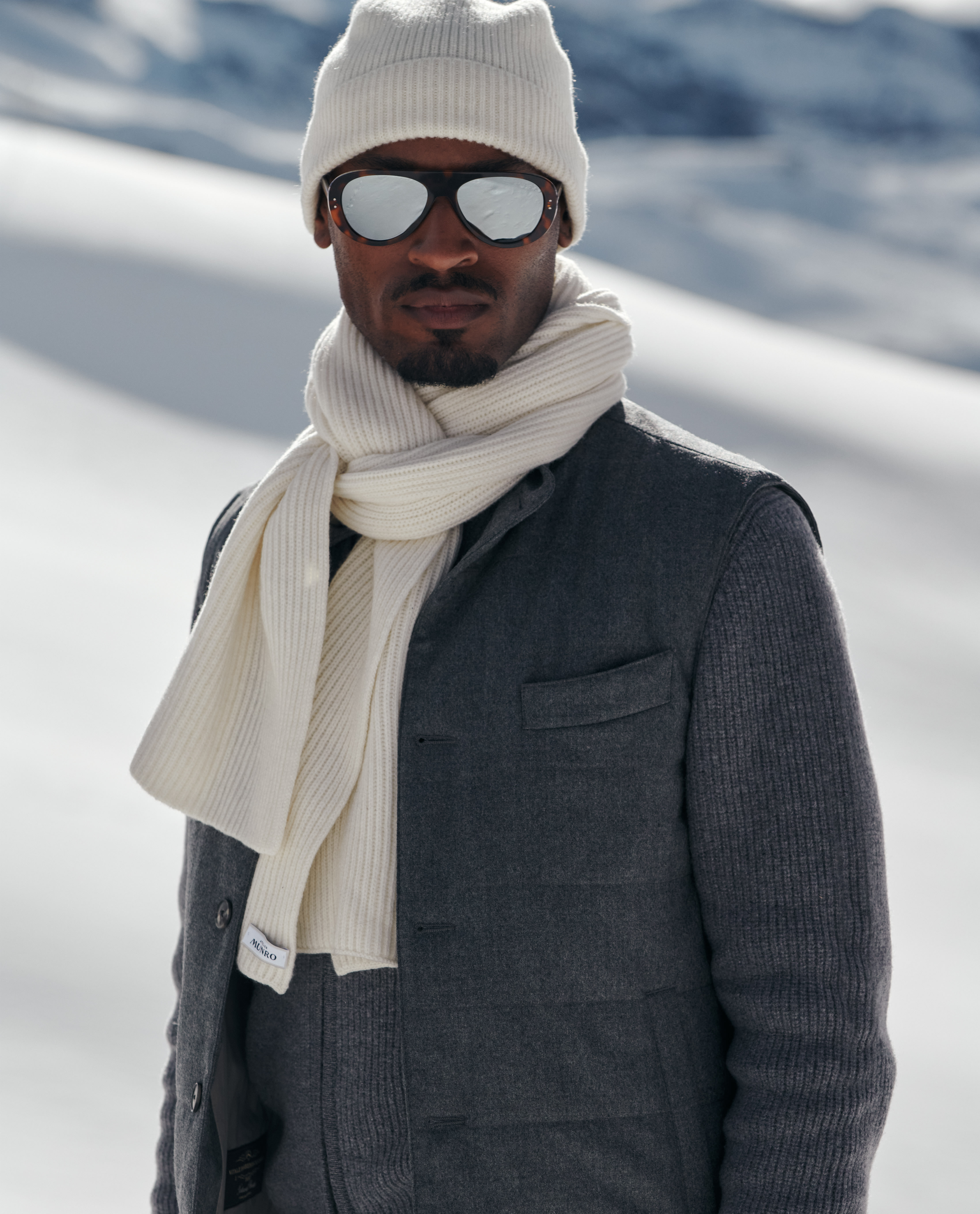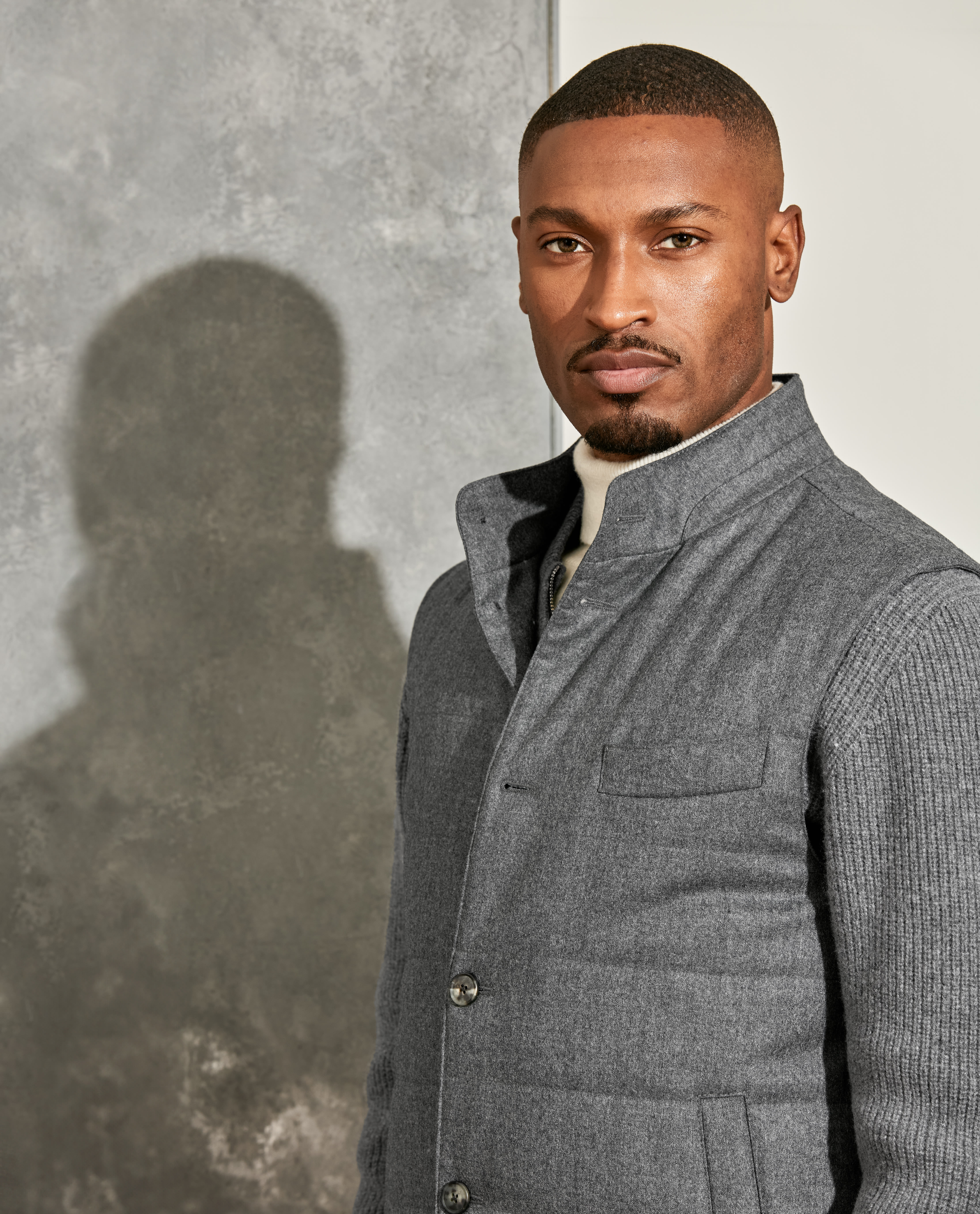 Craving a touch of luxury as you unwind? Opt for this heathered gray quilted vest and wool-cashmere leisure set — easy to adapt to mild or frosty temperatures, whether worn together or as separates. Layered here over a cashmere turtleneck knit with suede mountain boots for a refined look with a rugged edge.