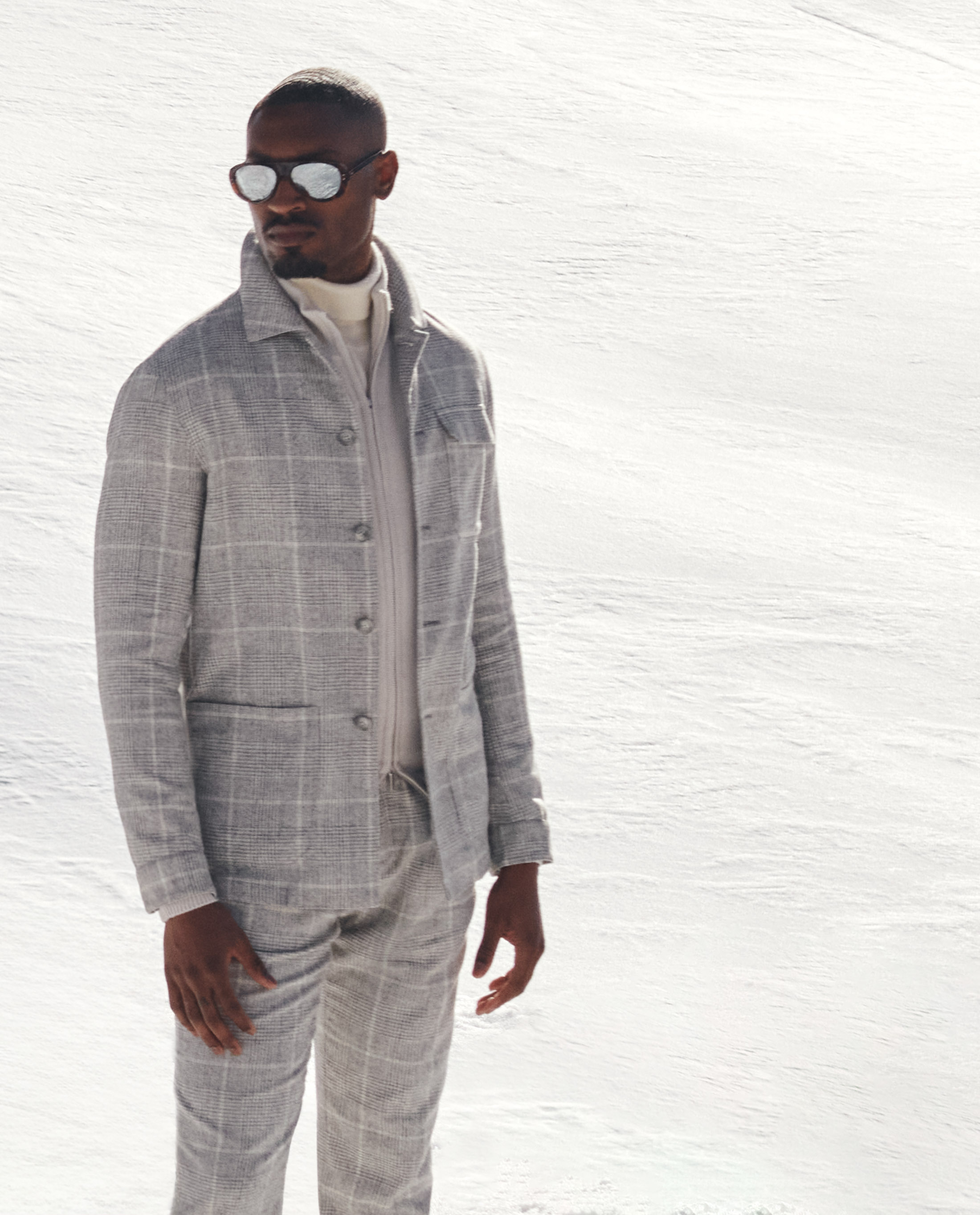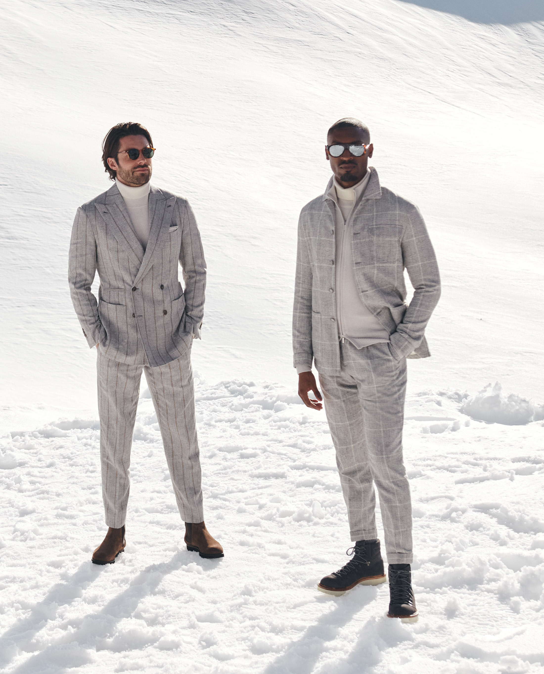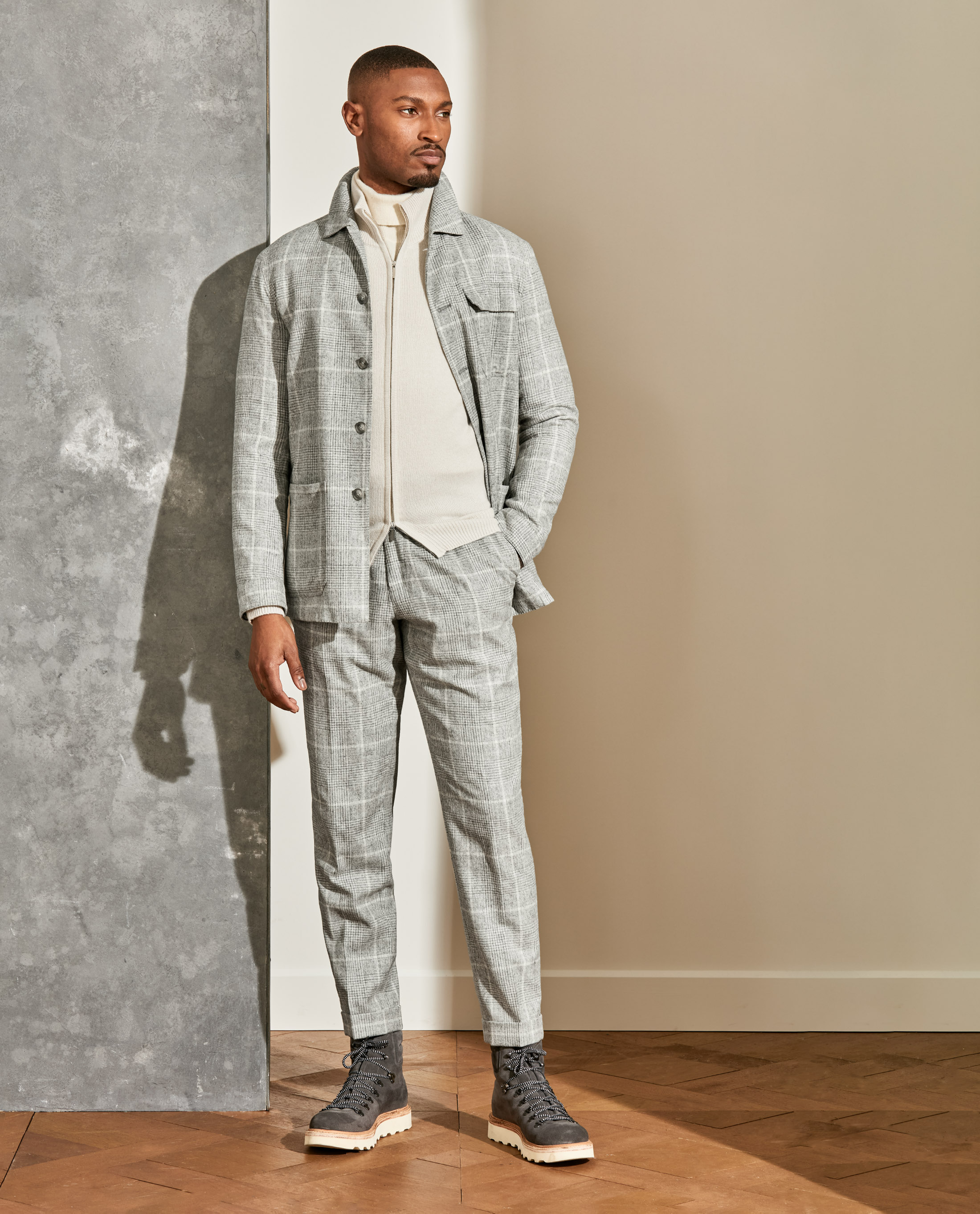 The ideal way to bundle up for your next winter weekend away. This laid-back plaid suit is lightweight yet warm thanks to its blend with rare alpaca wool. Styled with more soft gray and beige tones in luxurious fabrics that double as weather protection: a wool-cashmere hooded coat, layered cashmere knits, and suede mountain boots.