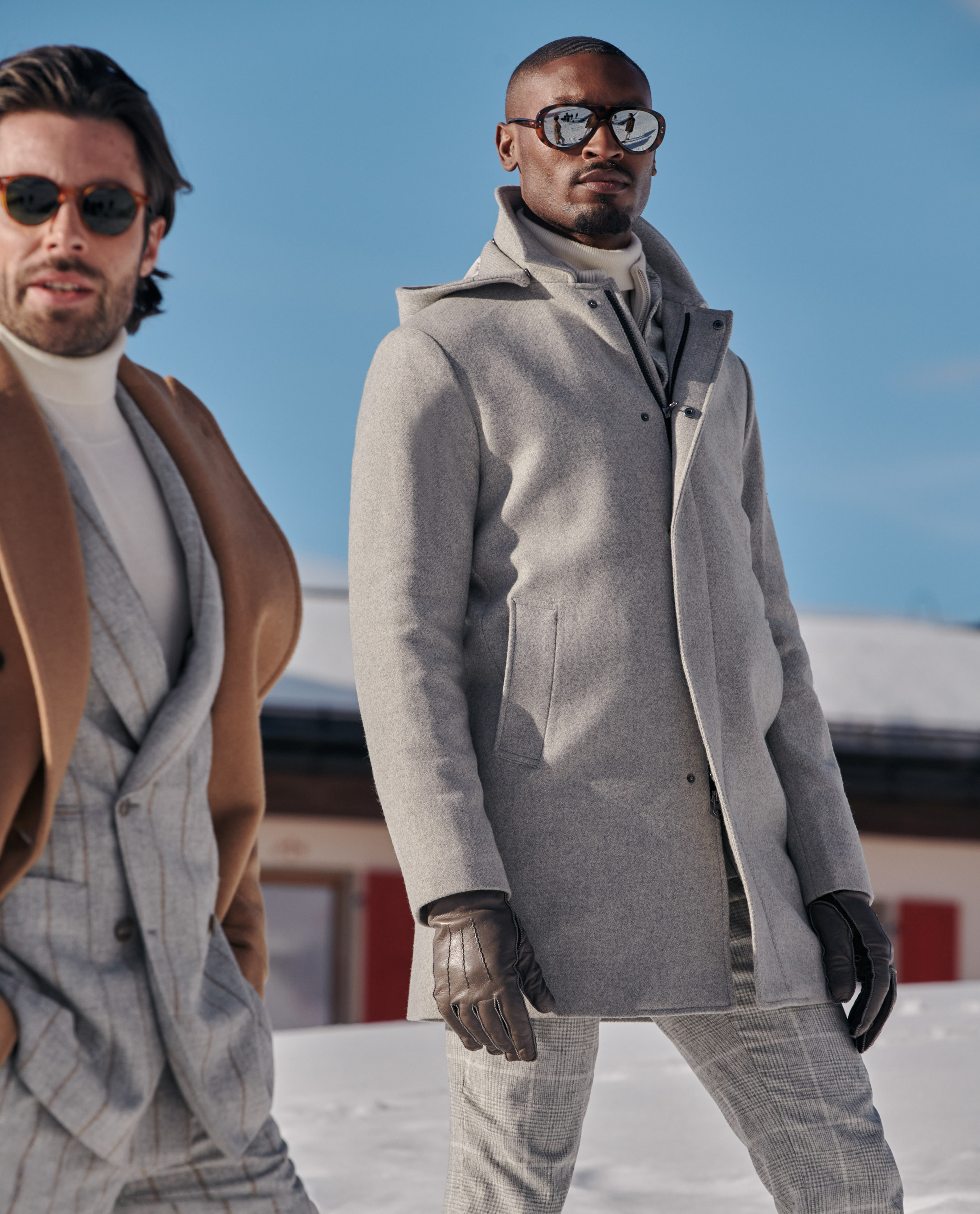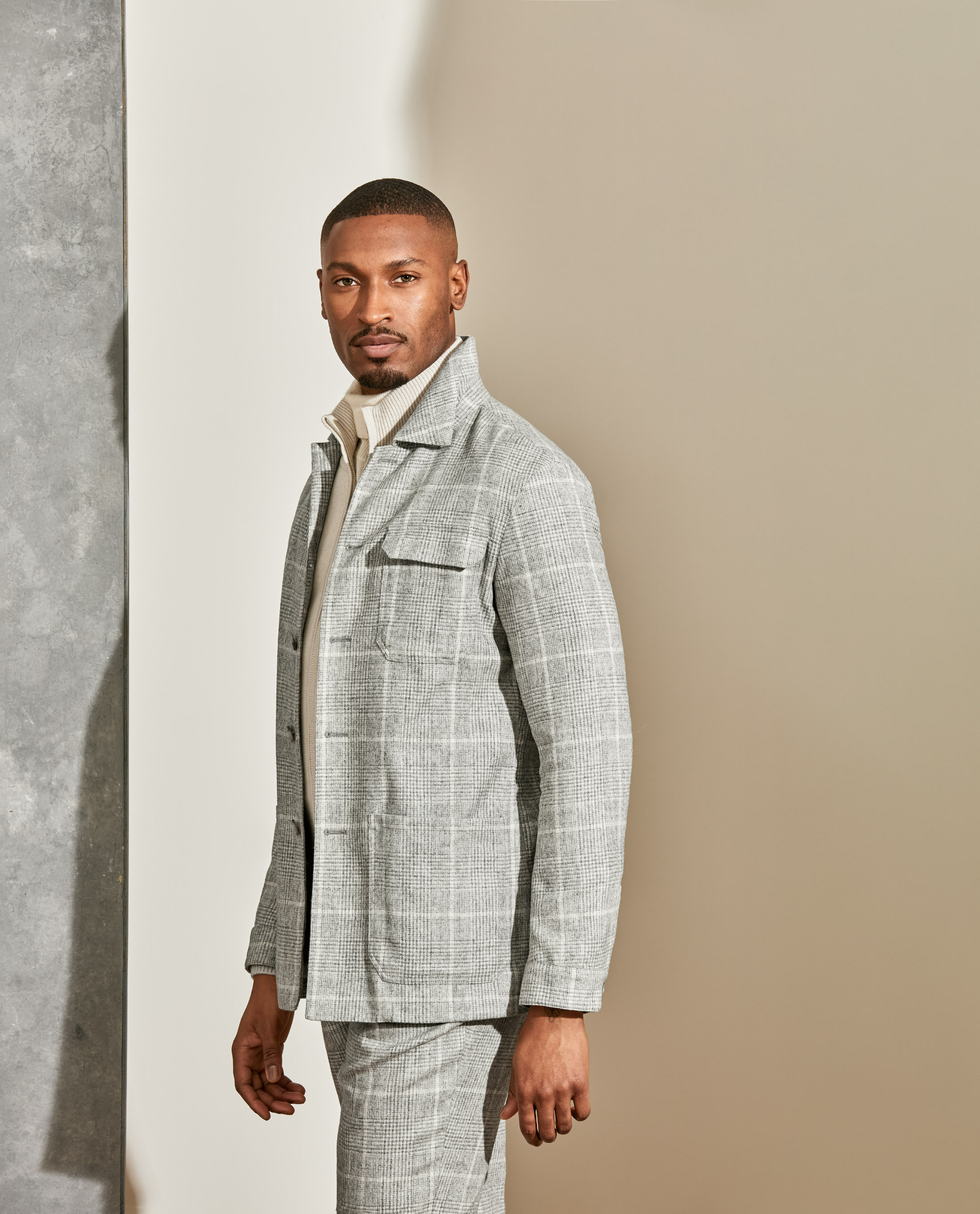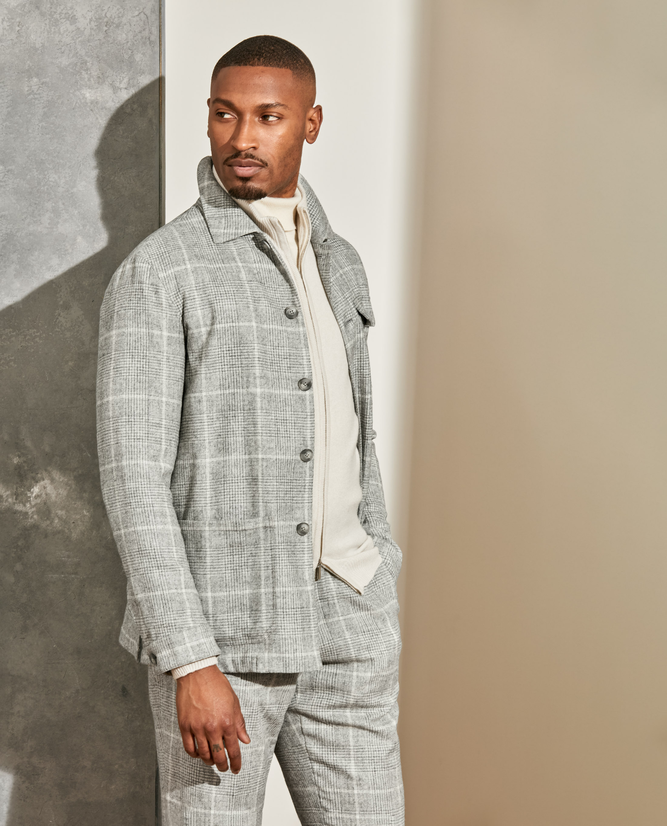 The ideal way to bundle up for your next winter weekend away. This laid-back plaid suit is lightweight yet warm thanks to its blend with rare alpaca wool. Styled with more soft gray and beige tones in luxurious fabrics that double as weather protection: a wool-cashmere hooded coat, layered cashmere knits, and suede mountain boots.