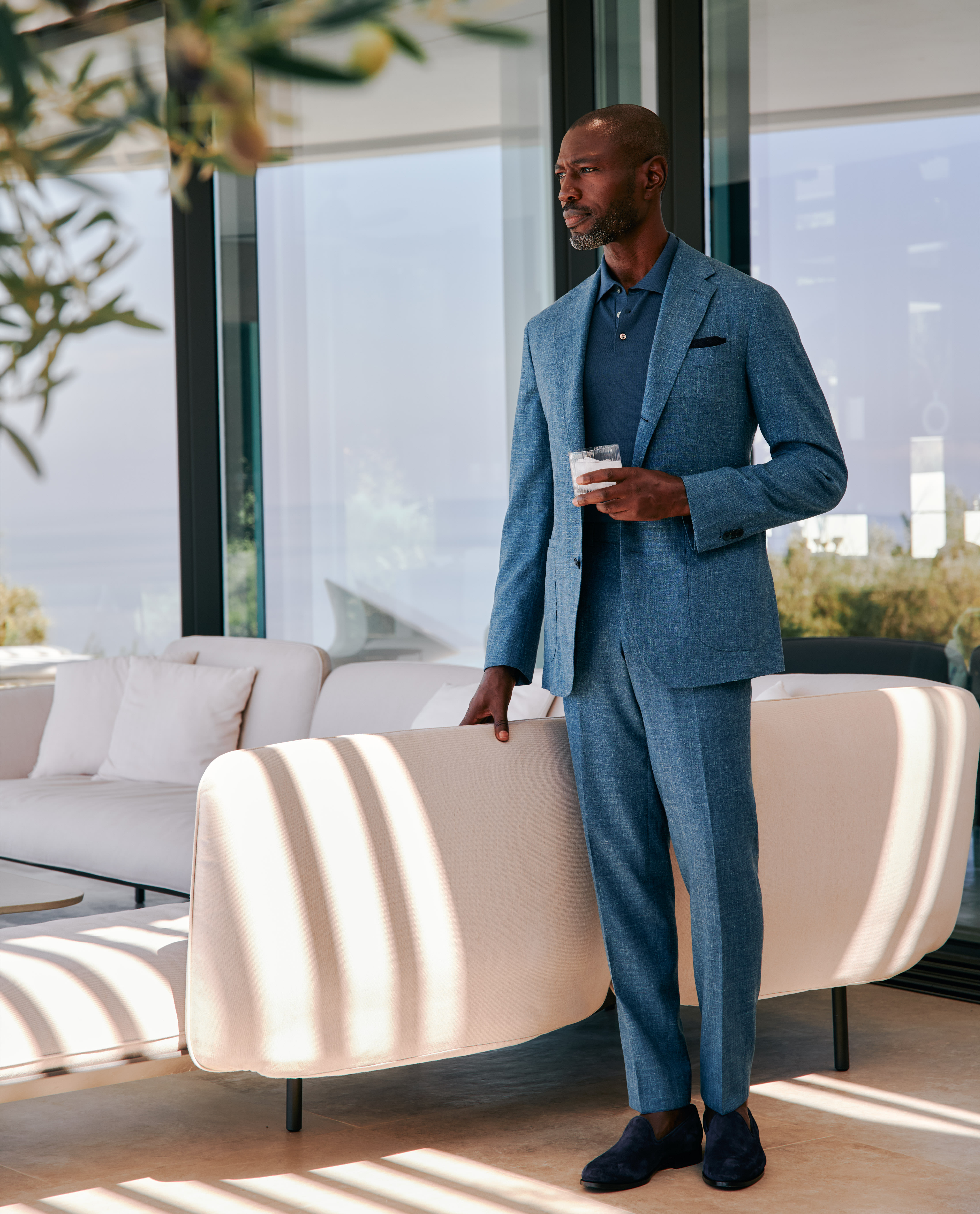 Reinvent the formal silhouette with a bold, exciting color palette, exemplified here by this light petrol tropical-weave suit. Made all the more modern with a petrol blue polo knit, grenadine pocket square, and midnight blue suede loafers – altogether creating a fresh, refined take on warm-weather sophistication.