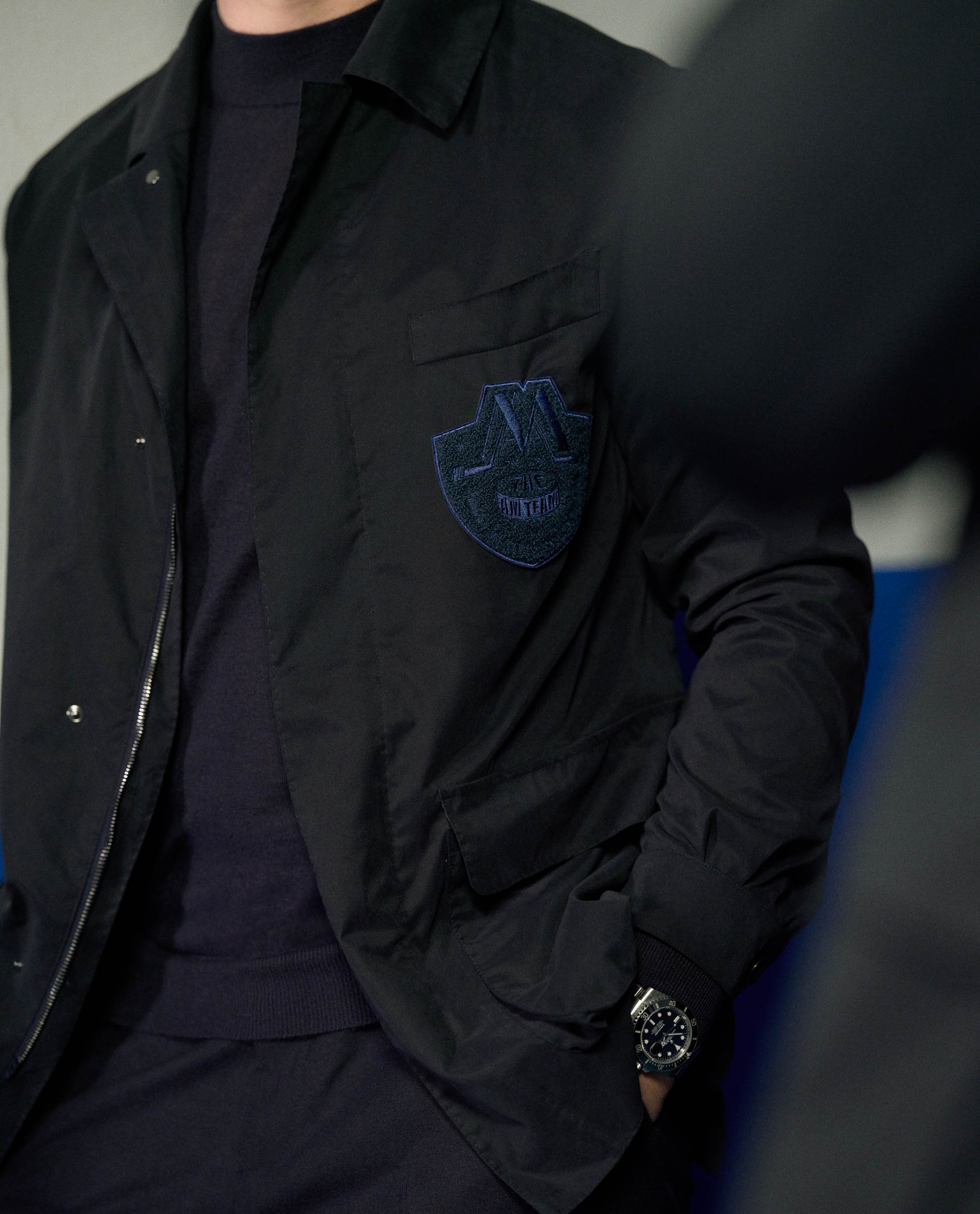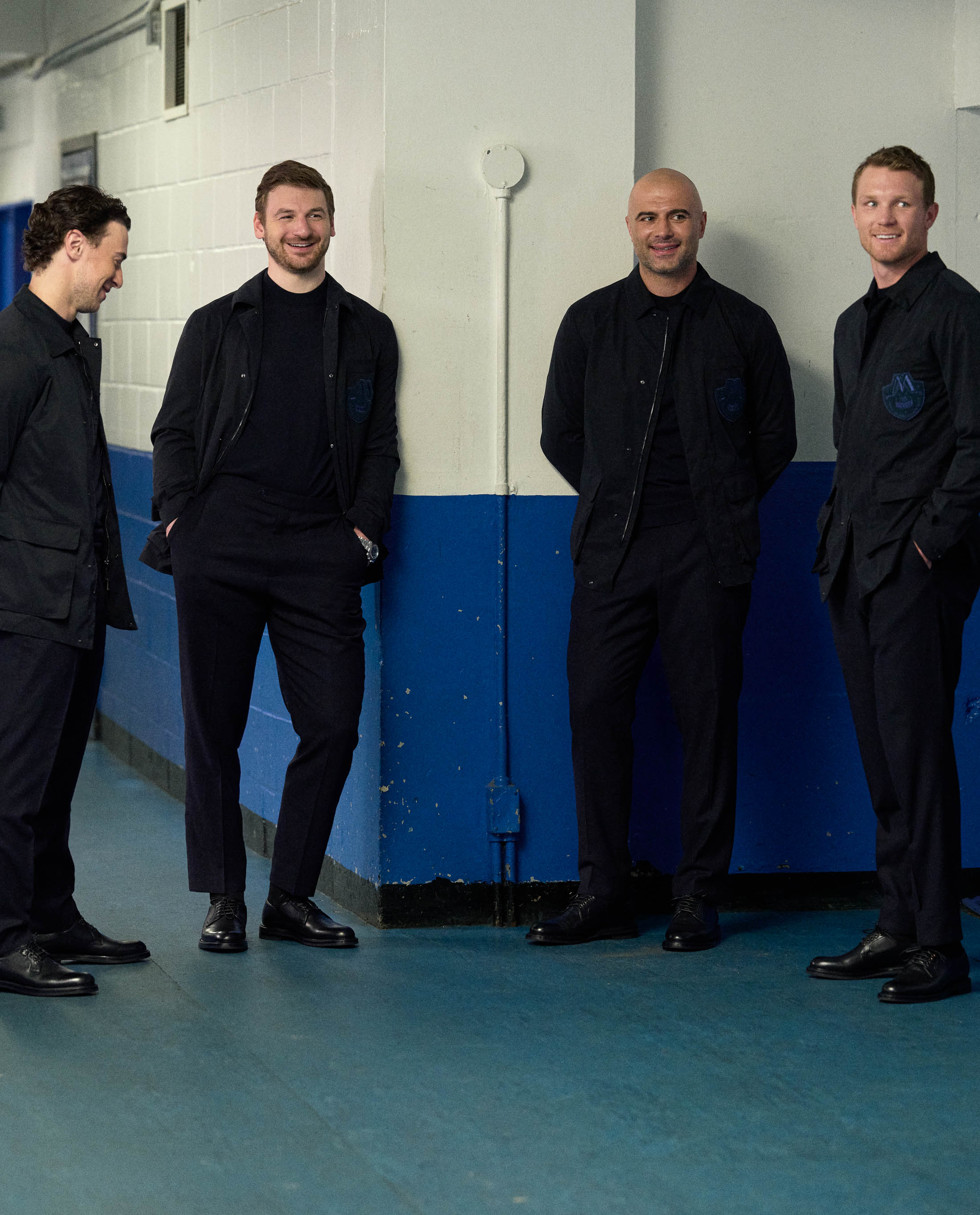 To help get his head in the zone, NHL forward Zach Hyman turns to an all-midnight blue ensemble. Featuring a lightweight, water-repellent jacket with a modern zip and snap closure, his addition of a tonal crew neck knit and stretch trousers creates a look that’s as chic as it is practical. Styled with black leather Bluchers for a refined pre-game edge.