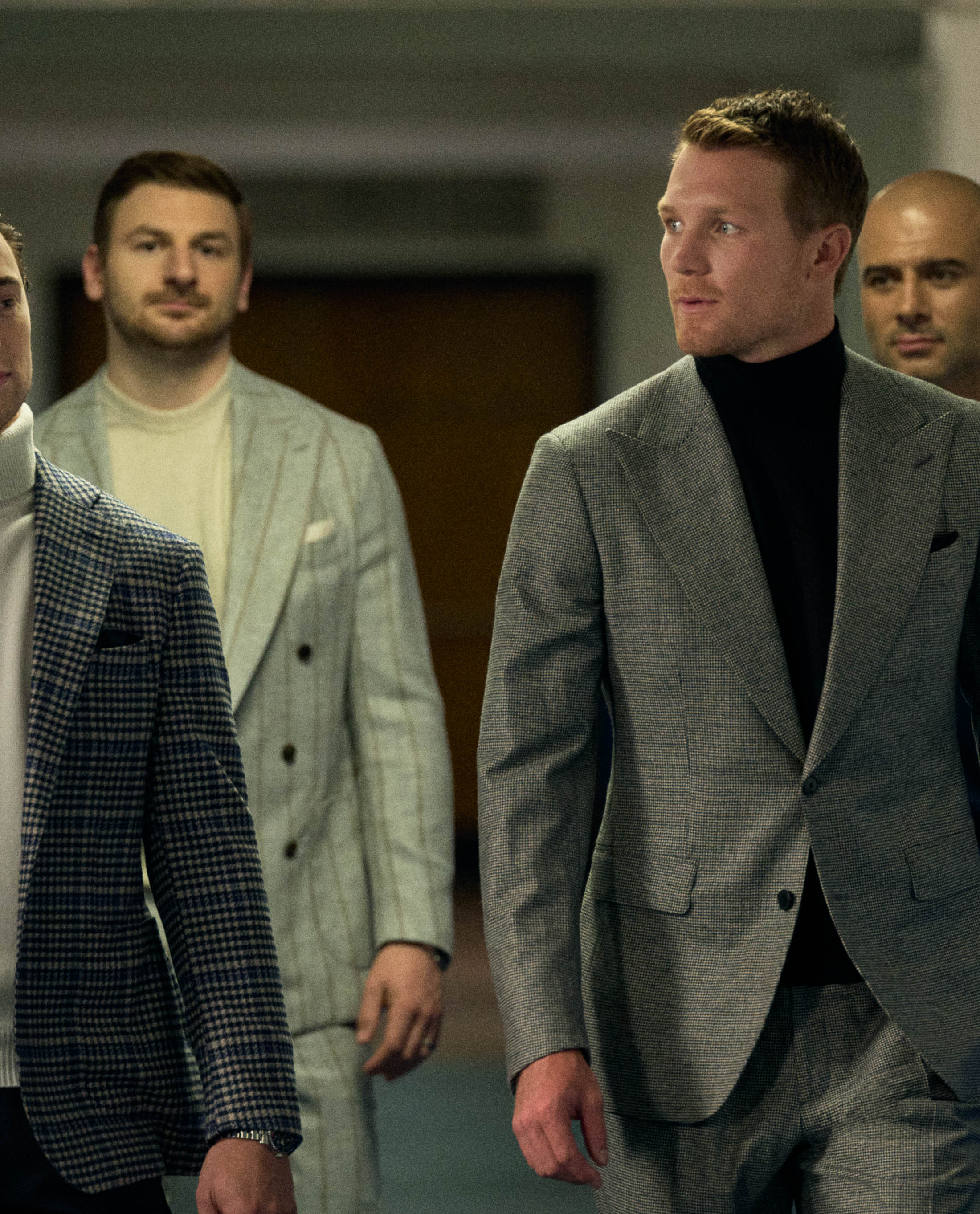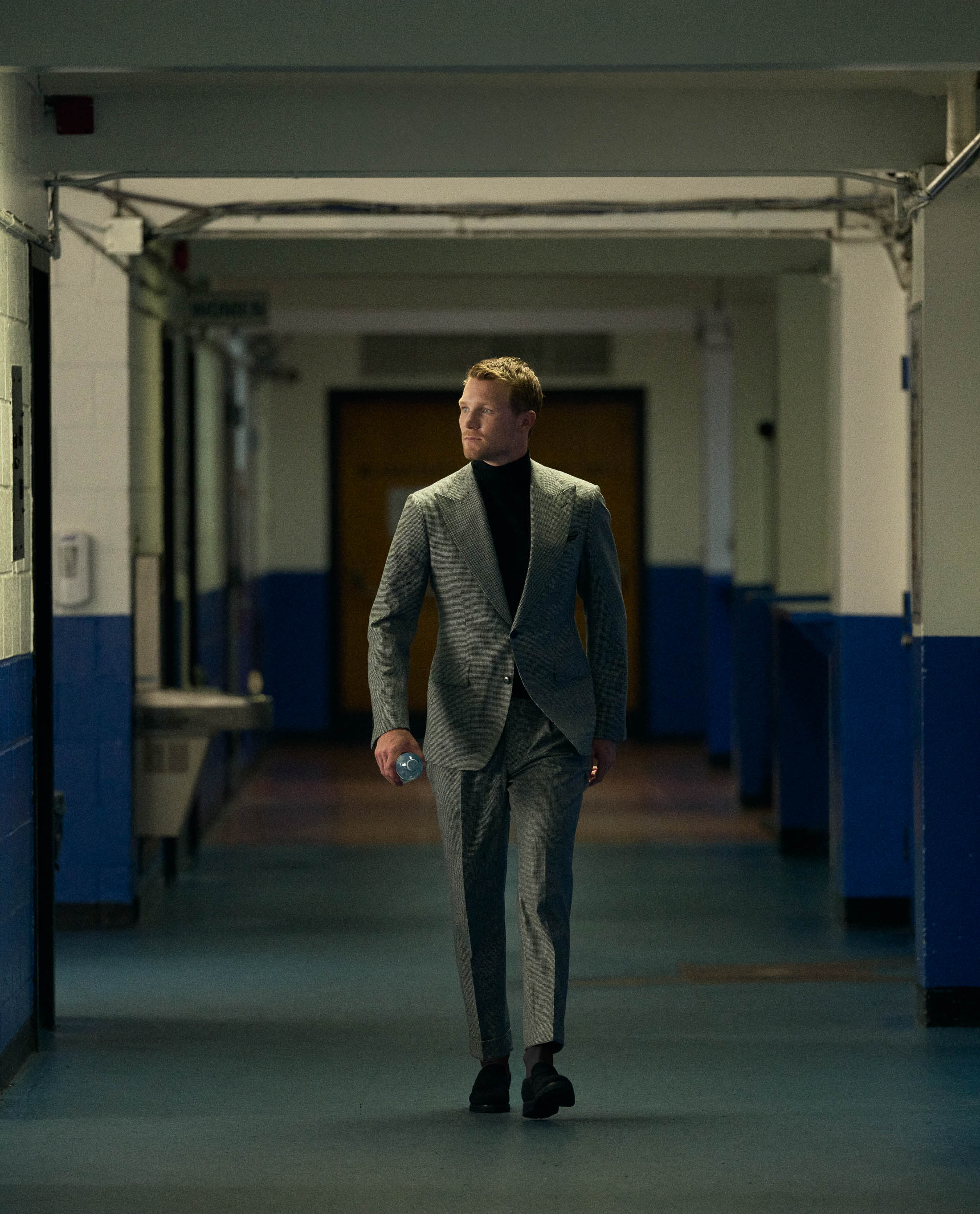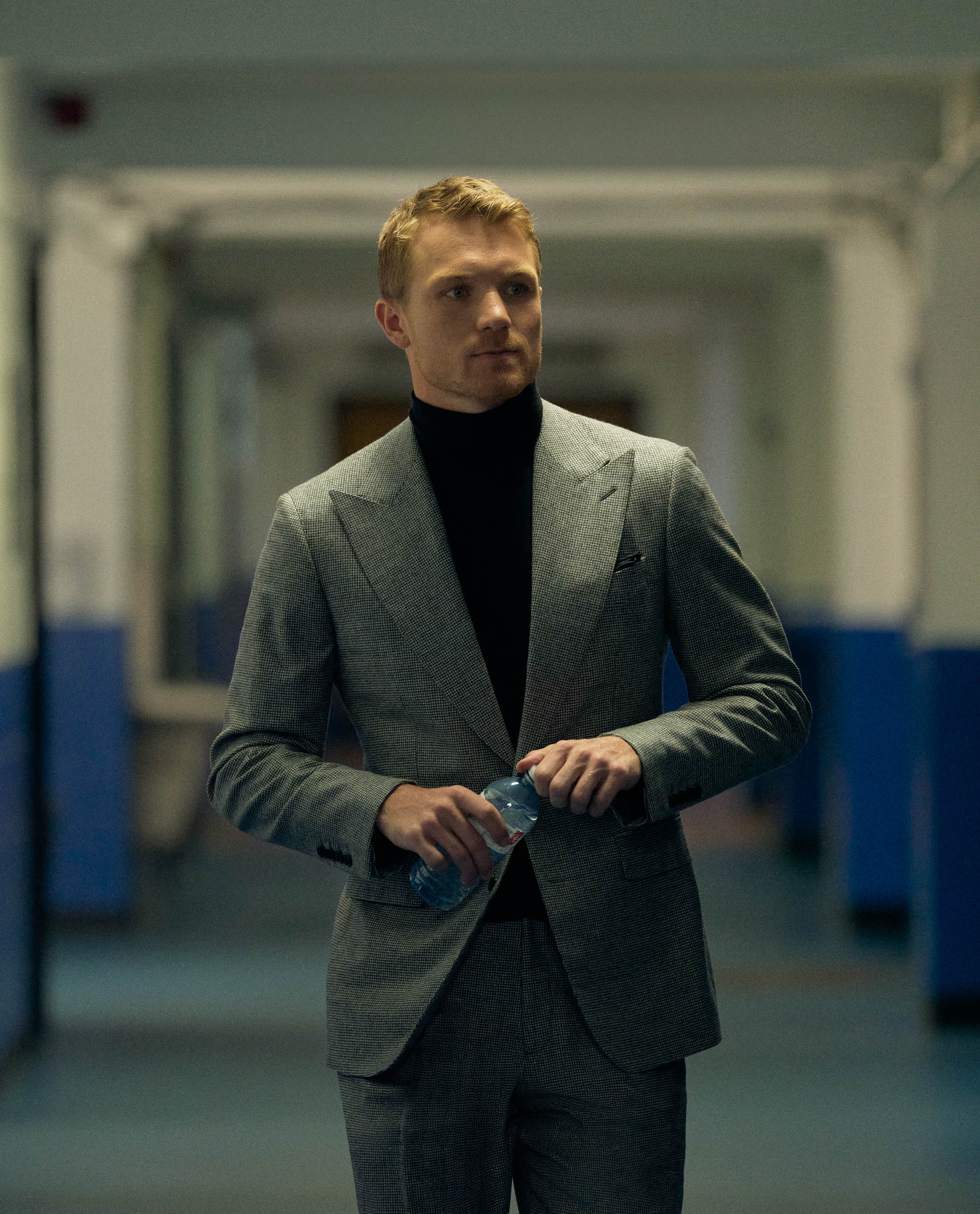 Ty's 2-piece suit with wide peak lapels pairs with a black turtleneck knit for an aesthetic aptly known as “athletic chic.” Crafted from a micro-houndstooth weave – responsible for its versatile salt-and-pepper effect – this luxurious investment piece can easily be styled for a range of occasions. Finished here with a black silk pocket square and black suede penny loafers, for a smooth transition from winter business settings to a sophisticated evening out.