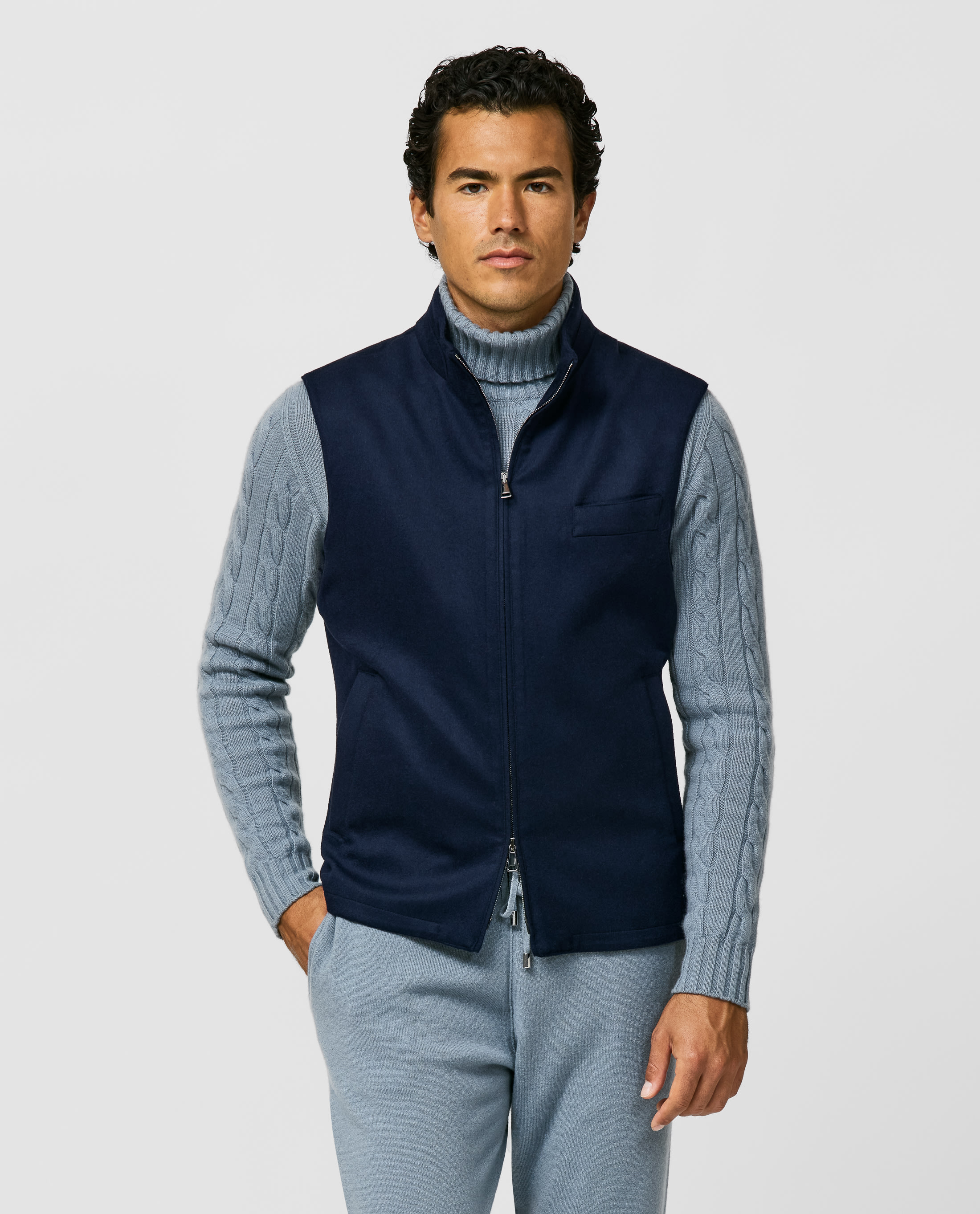 This midnight blue vest is crafted from the luxurious Bactrian camel fleece fabric made in Italy by Loro Piana. Sourced from the rare, noble fibers of baby camels in Mongolia, this ancestral quality is known for its exceptional softness, insulation, and natural color. Style it with a turtle neck, leisure pants, and sneakers to complete the look. Make this vest your own with our many customization options to choose from. Rare Precious fibers Warm Soft
