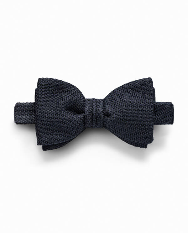 This Neapolitan blue 3-piece crafted from wool-mohair is a modern-meets-timeless tux. Paired by Simo with a white sateen shirt, black patent penny loafers and a textured grenadine bow tie in midnight blue.