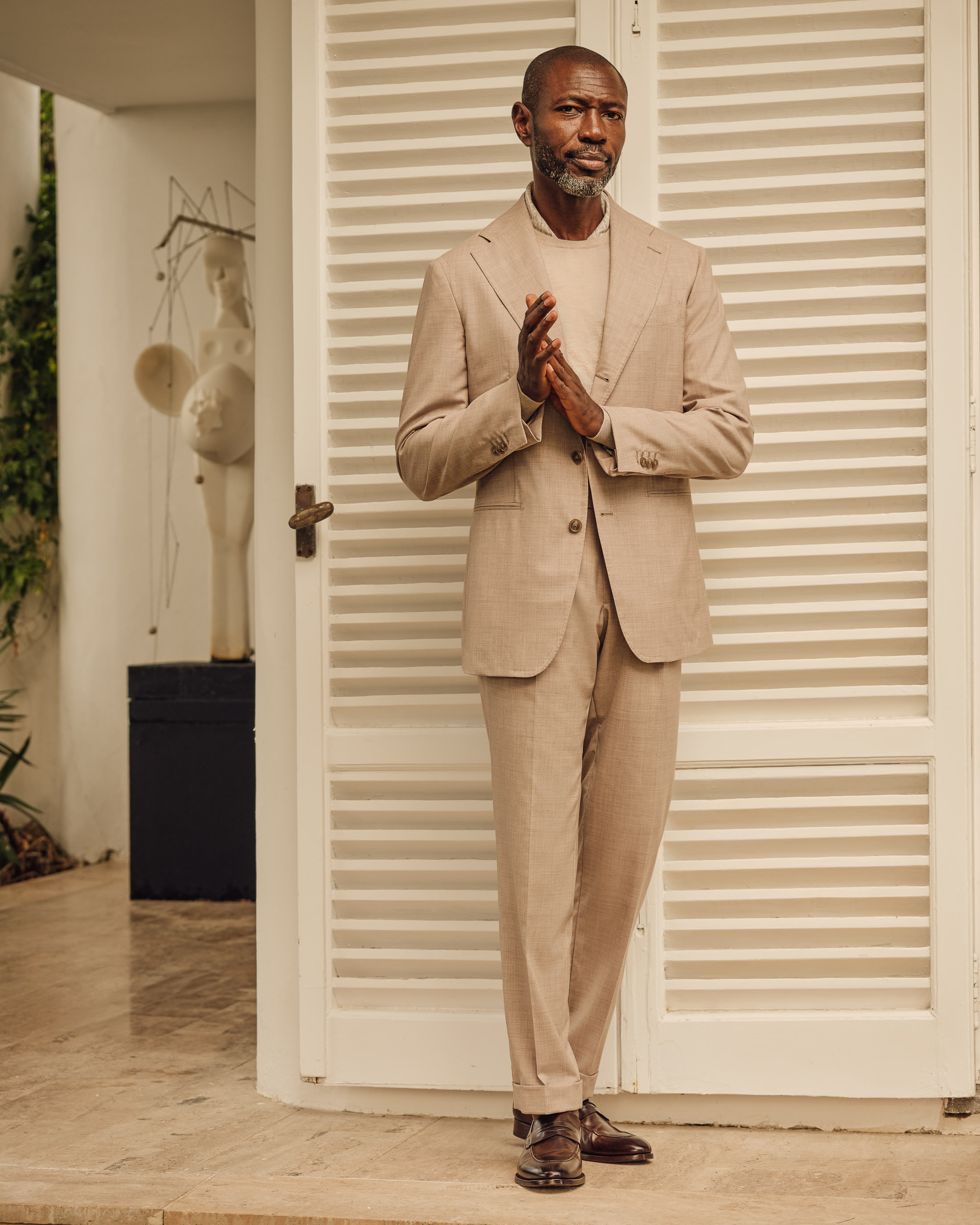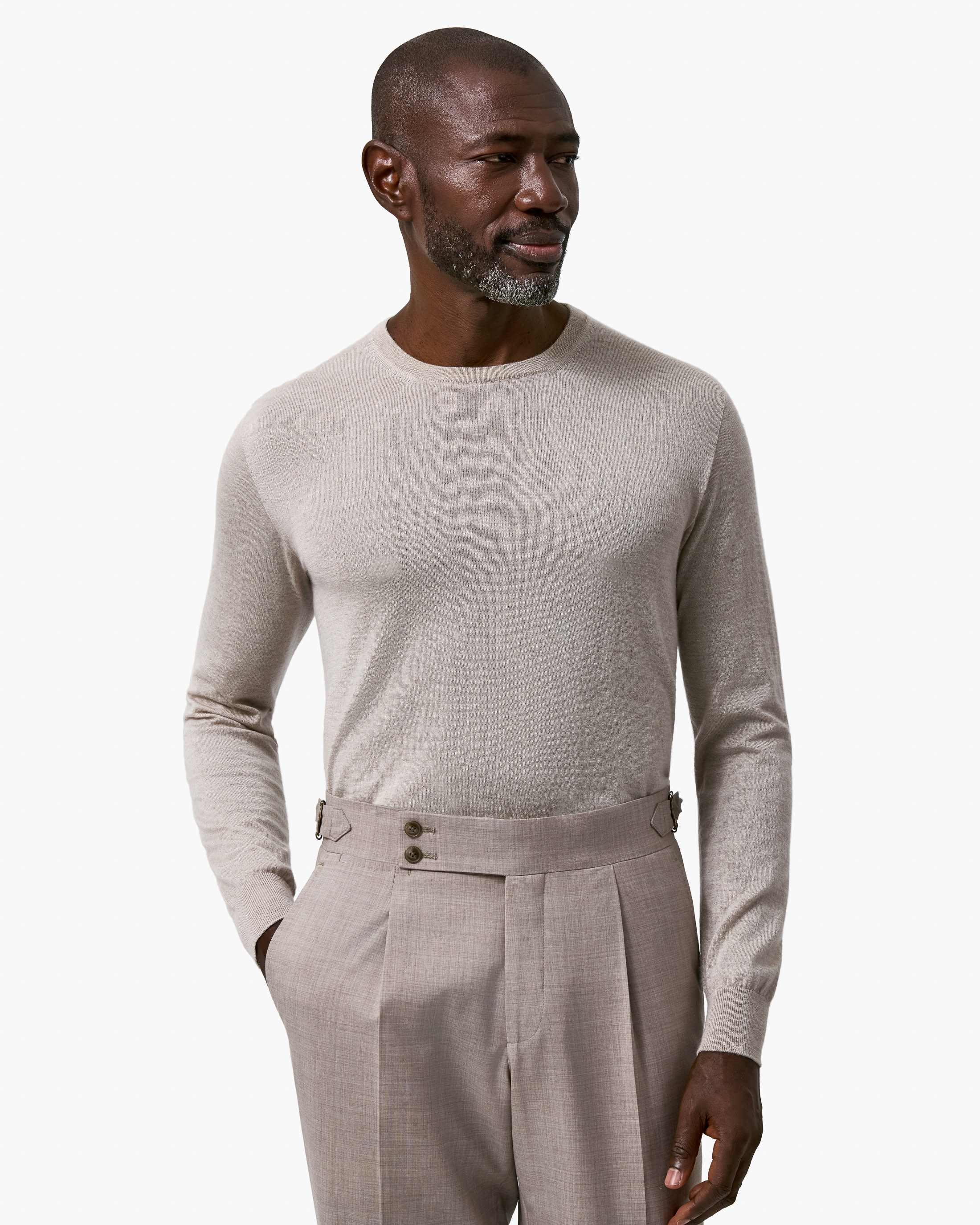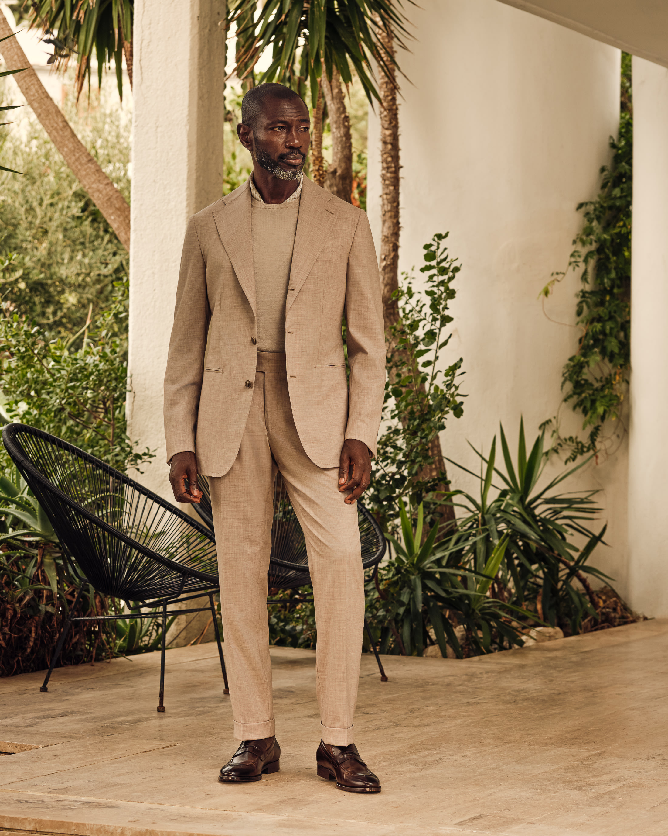 Where elegance meets ease. This look takes both craft and comfort seriously with an oatmeal suit woven from Loro Piana’s superfine natural-stretch wool, layered over a luxuriously soft cashmere-silk crew neck. Finished with a pair of classic loafers, it’s ideal for important meetings or elevated weekend events.