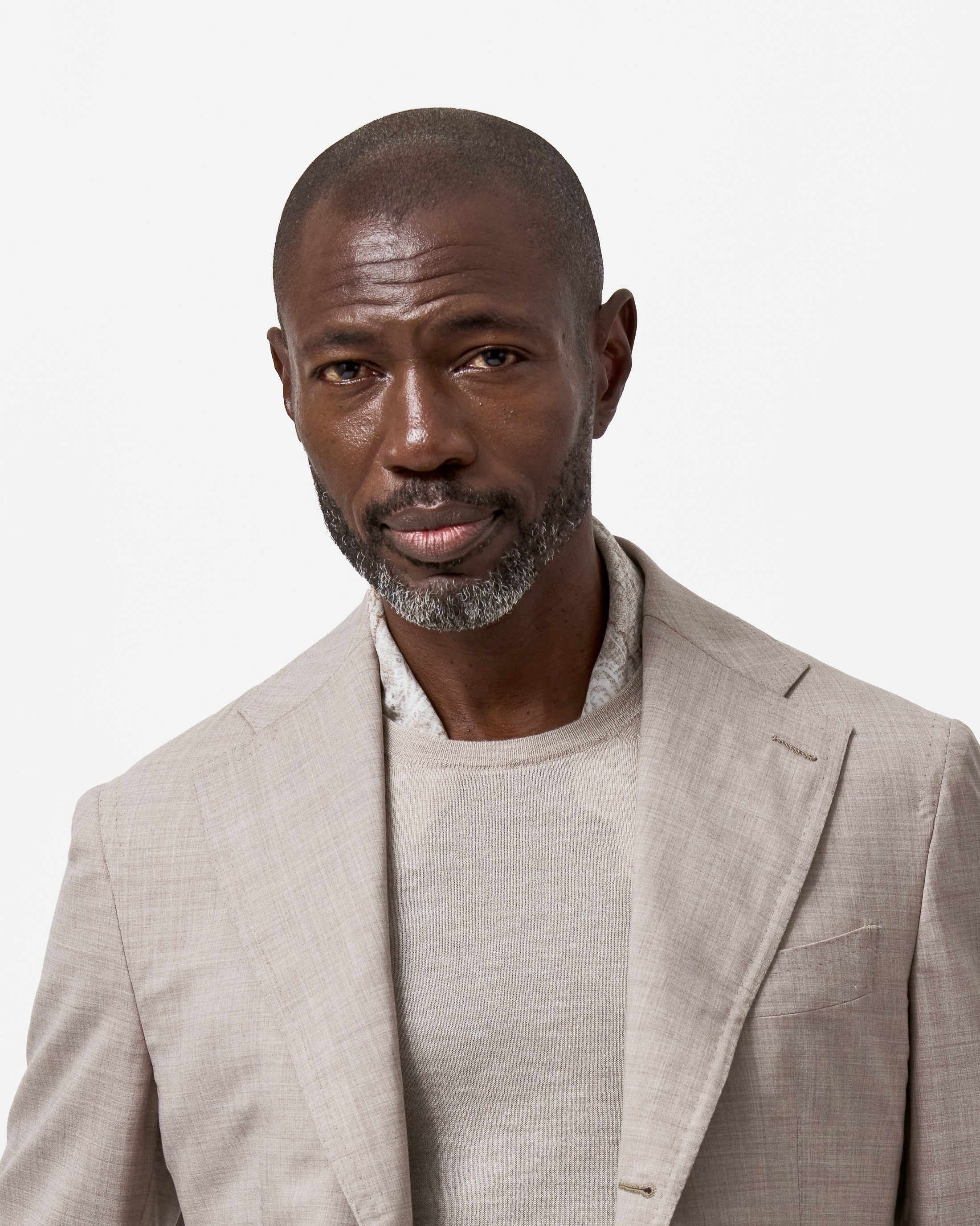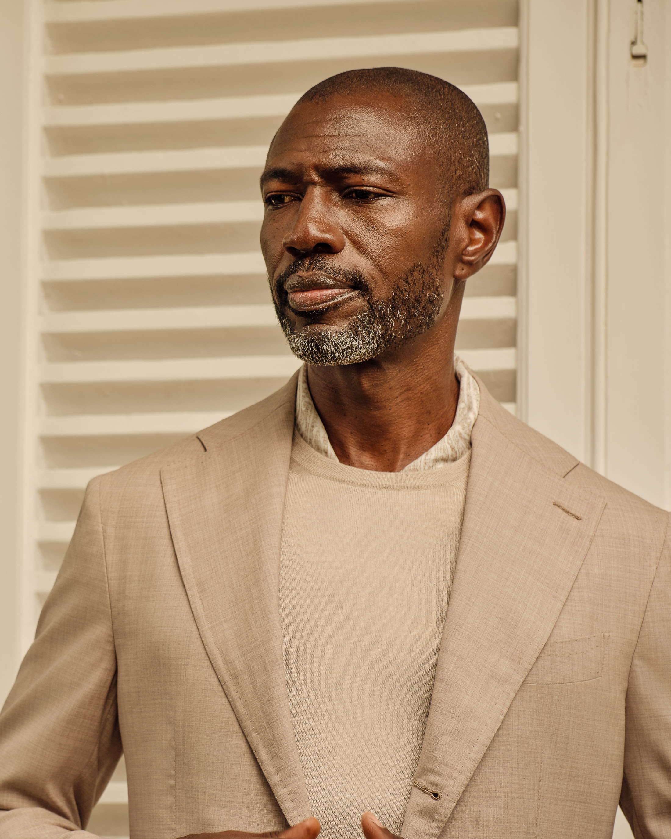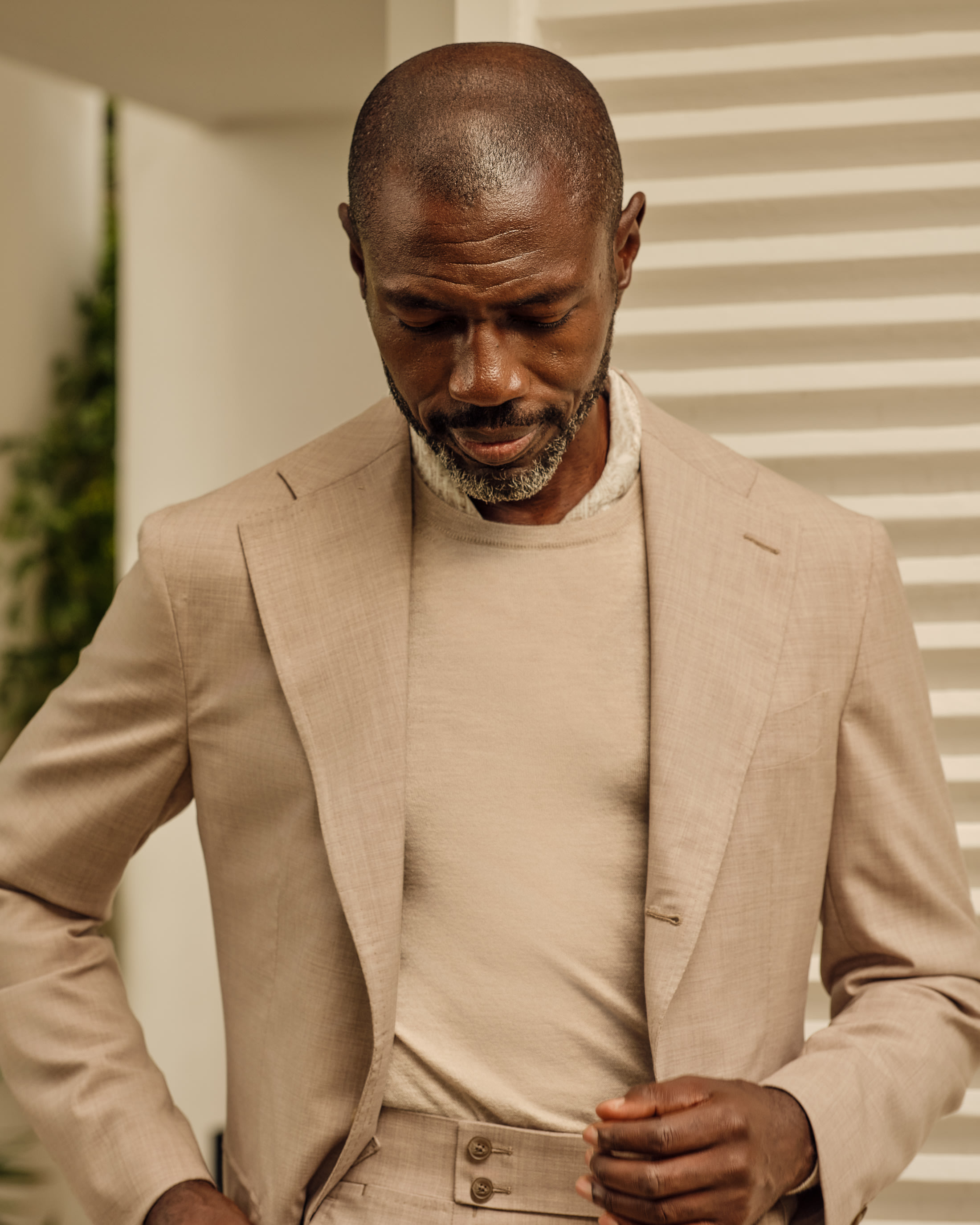 Where elegance meets ease. This look takes both craft and comfort seriously with an oatmeal suit woven from Loro Piana’s superfine natural-stretch wool, layered over a luxuriously soft cashmere-silk crew neck. Finished with a pair of classic loafers, it’s ideal for important meetings or elevated weekend events.