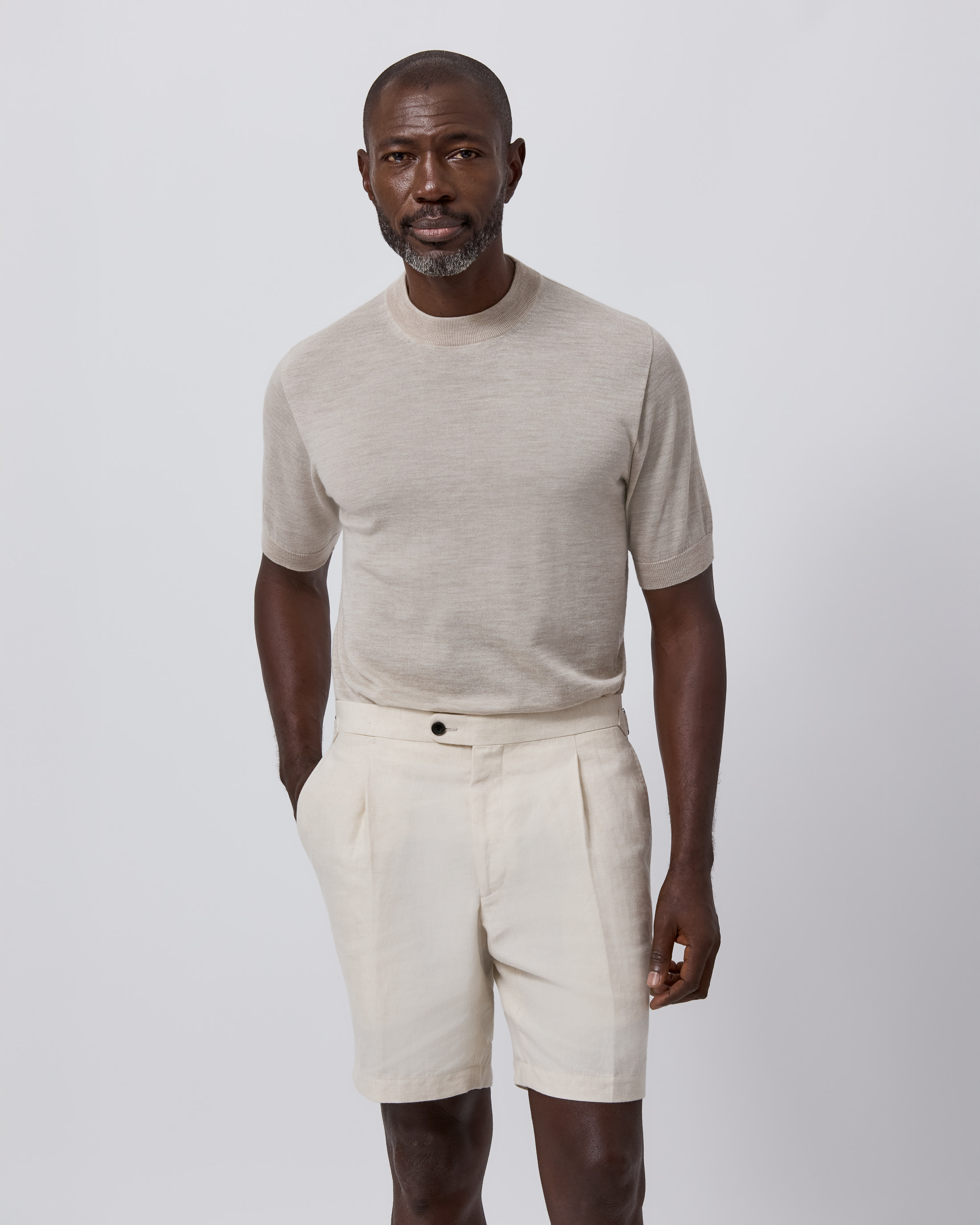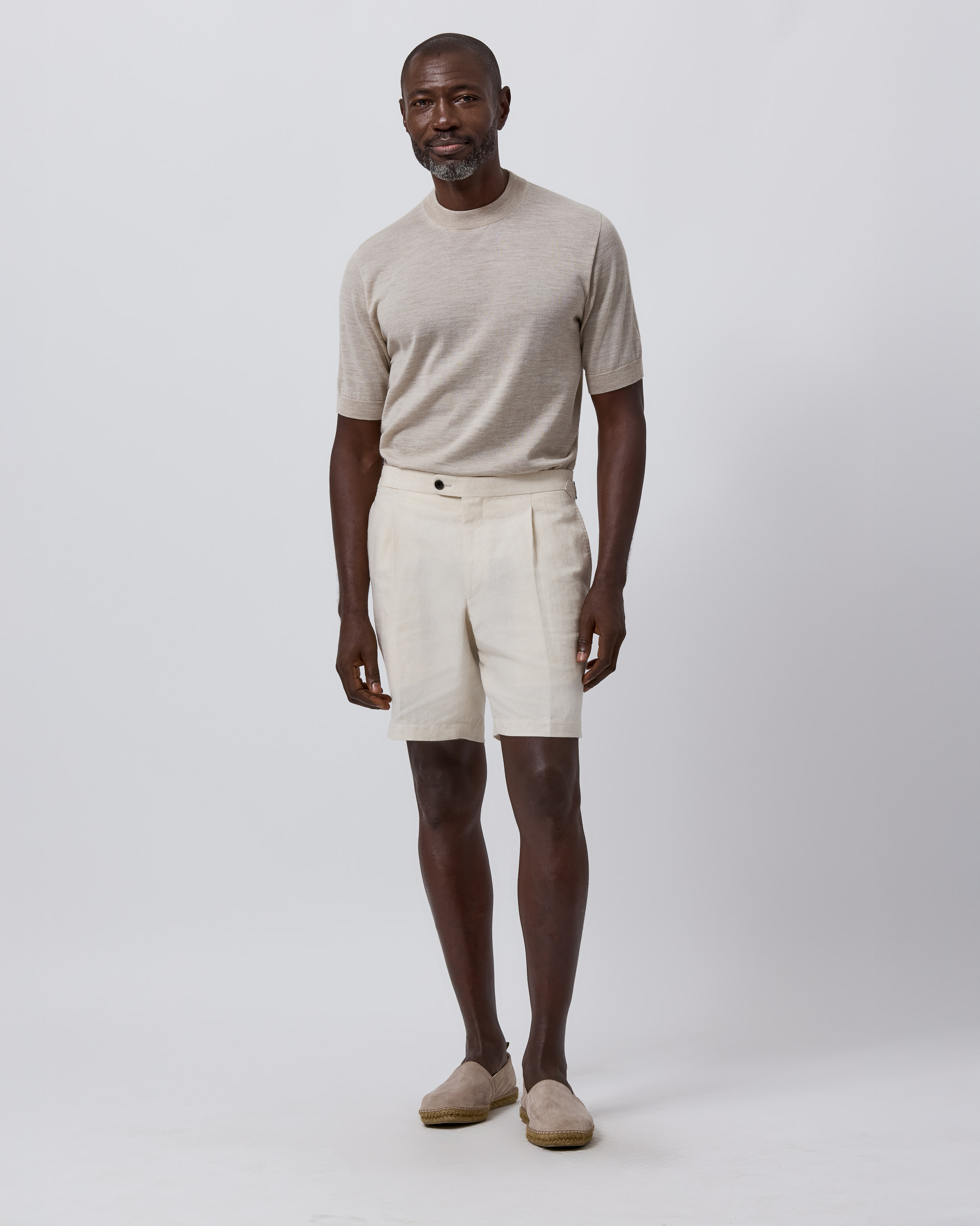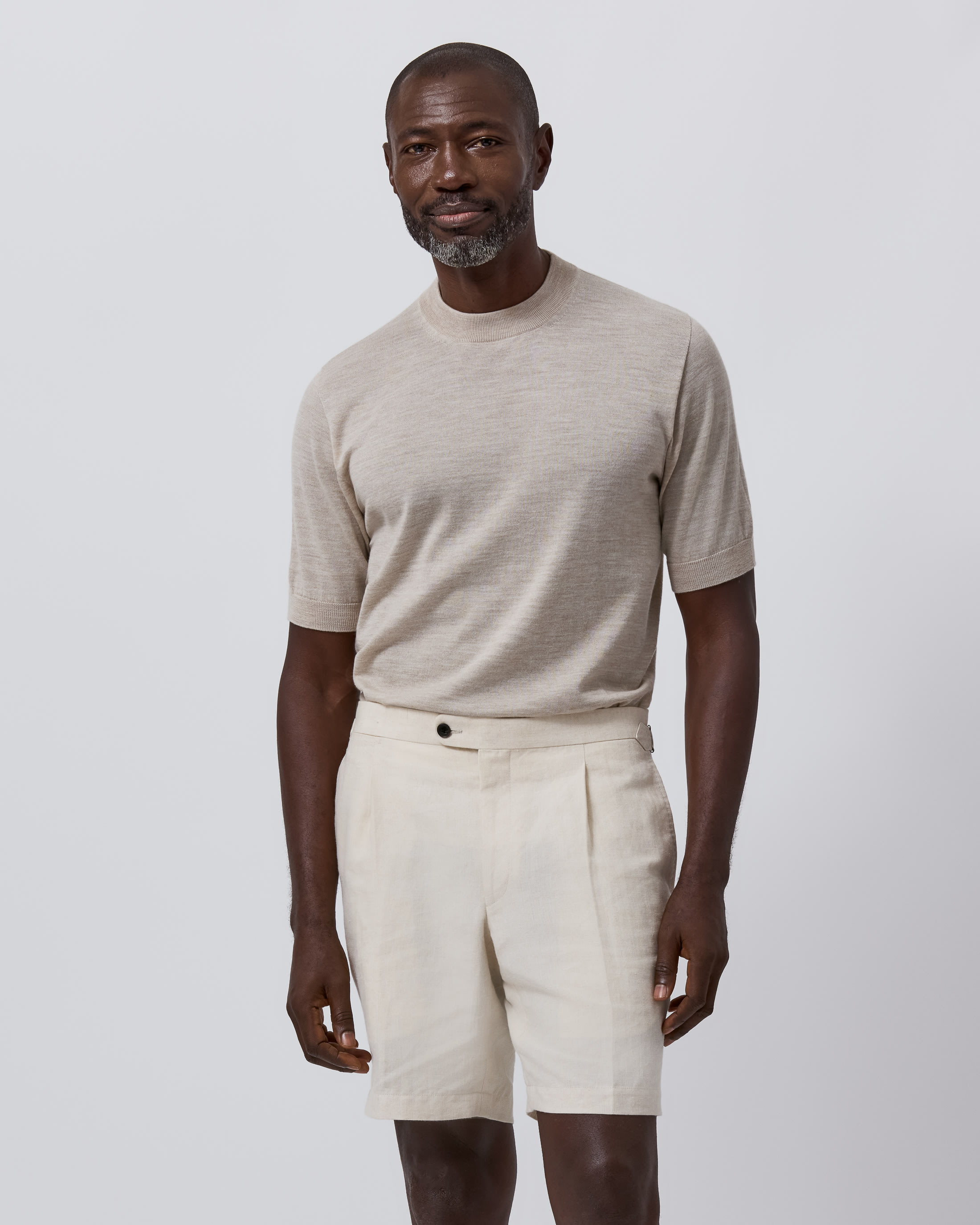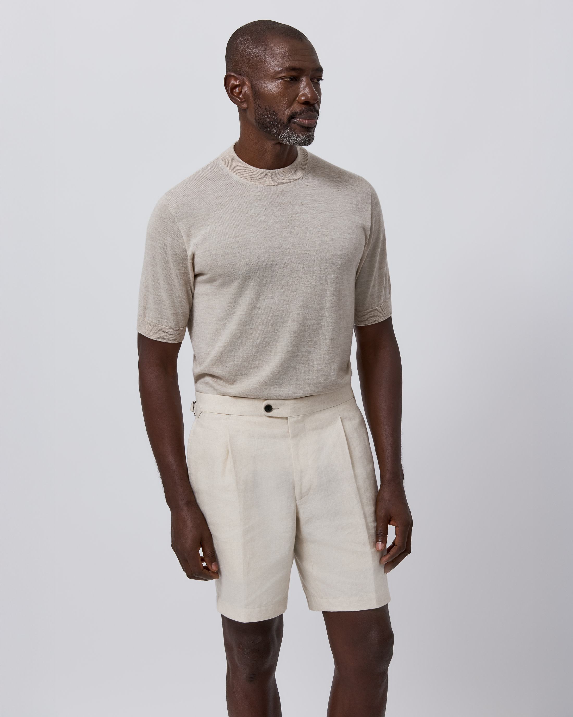 Intentional daytime dressing in a sandy palette for the very height of summer. Switch out your classic tee this season for a breathable crew neck knit crafted from the finest merino wool. To take it to the beach, simply pair with these pleated linen Bermudas and a minimalist cap in a matching muted hue.