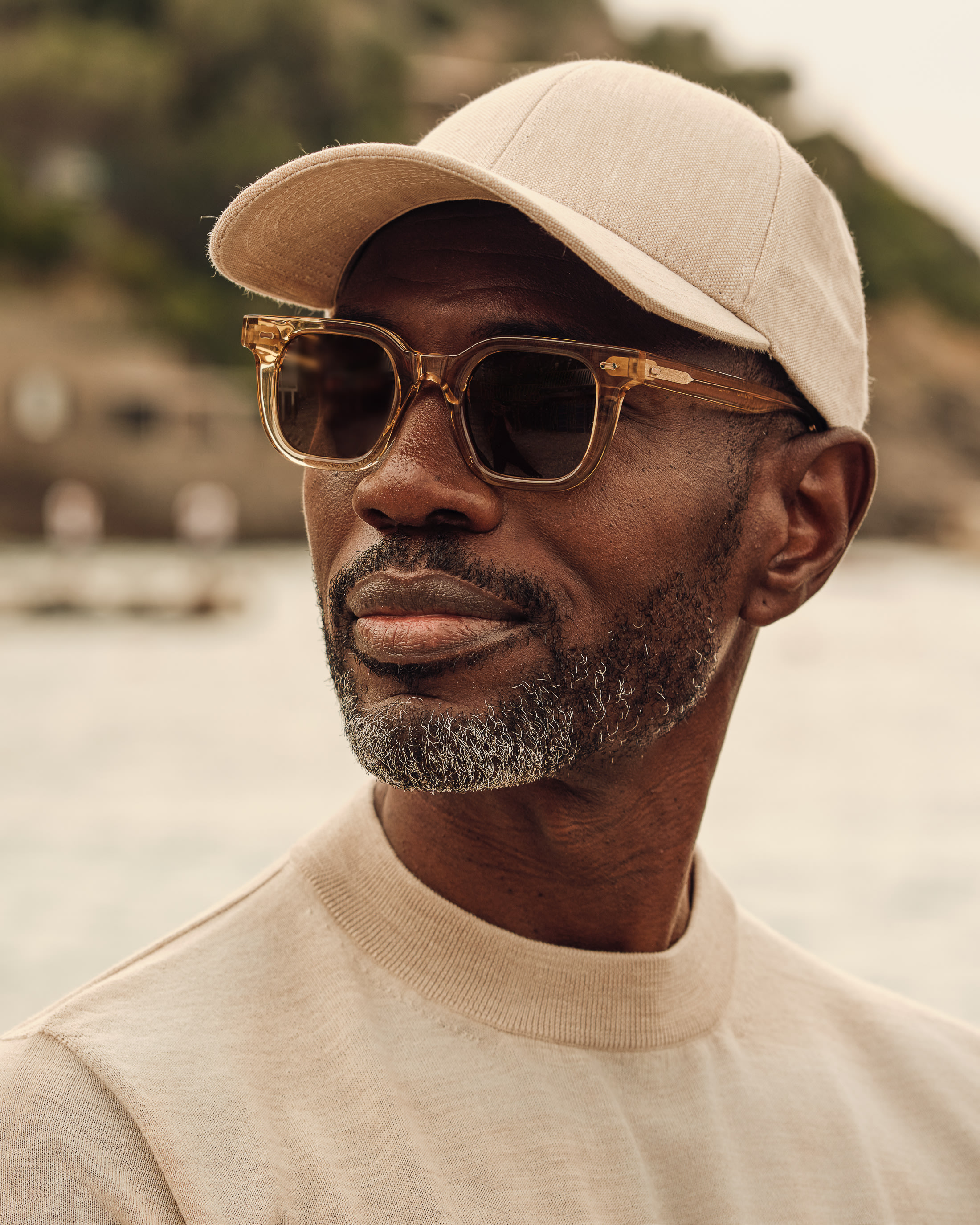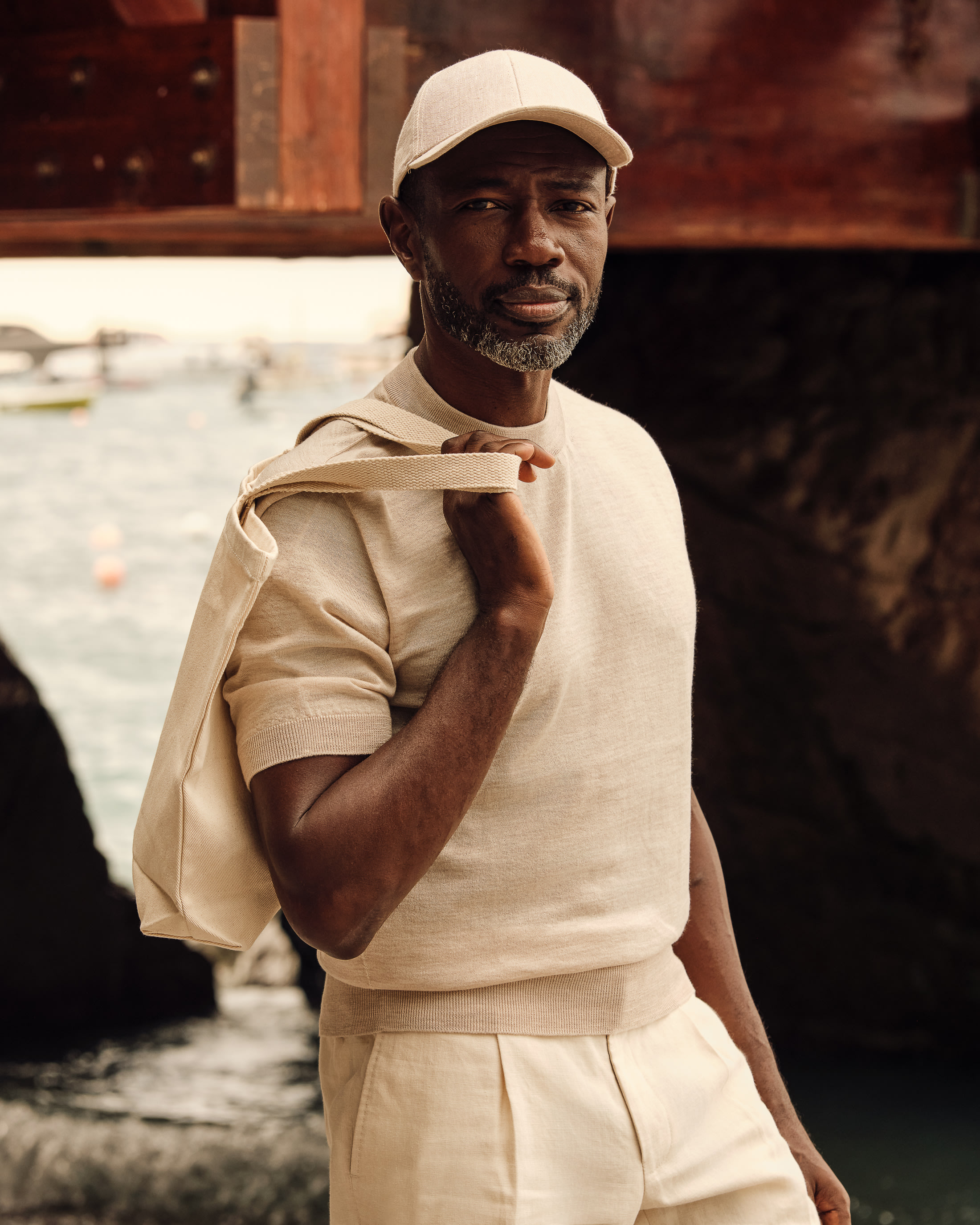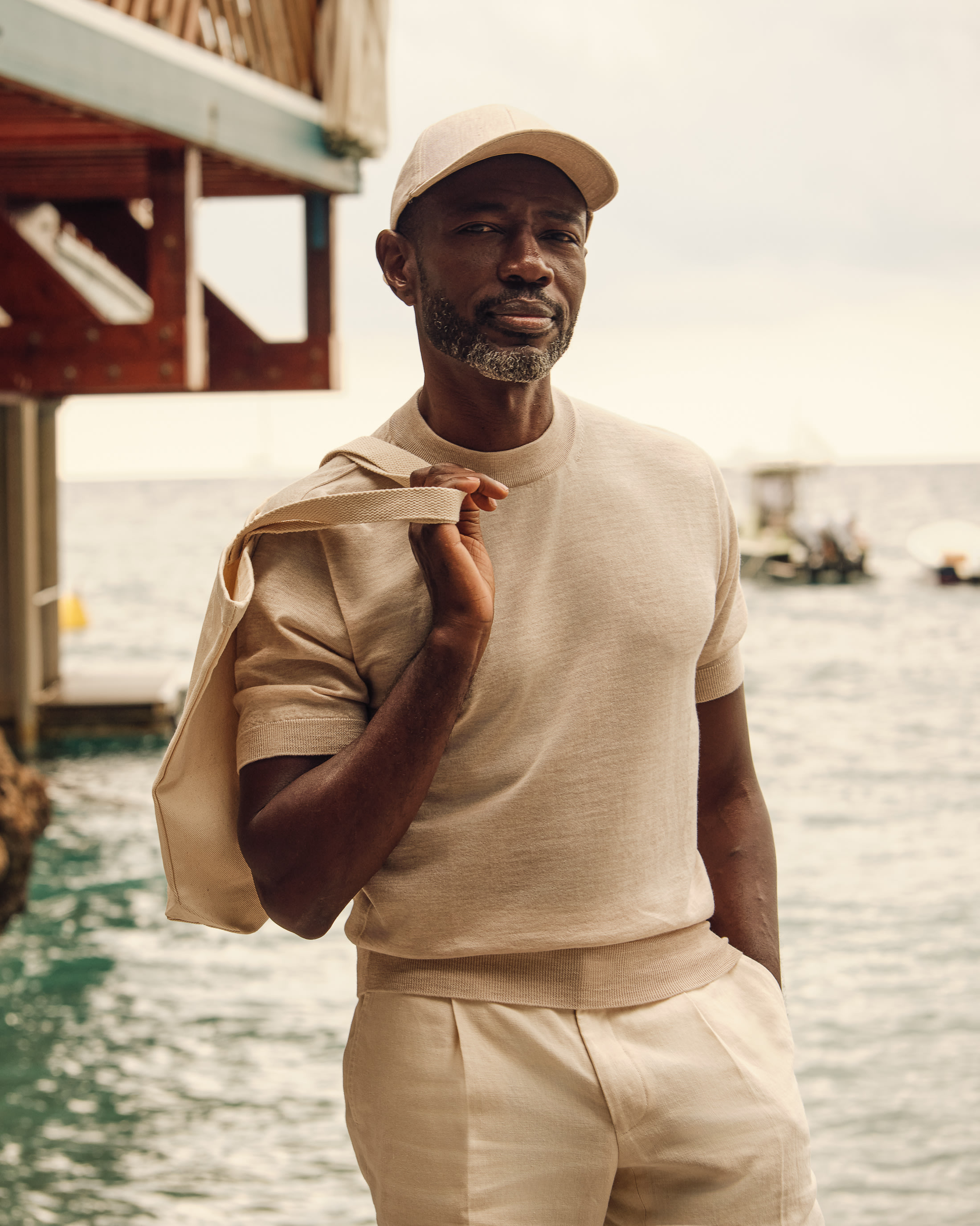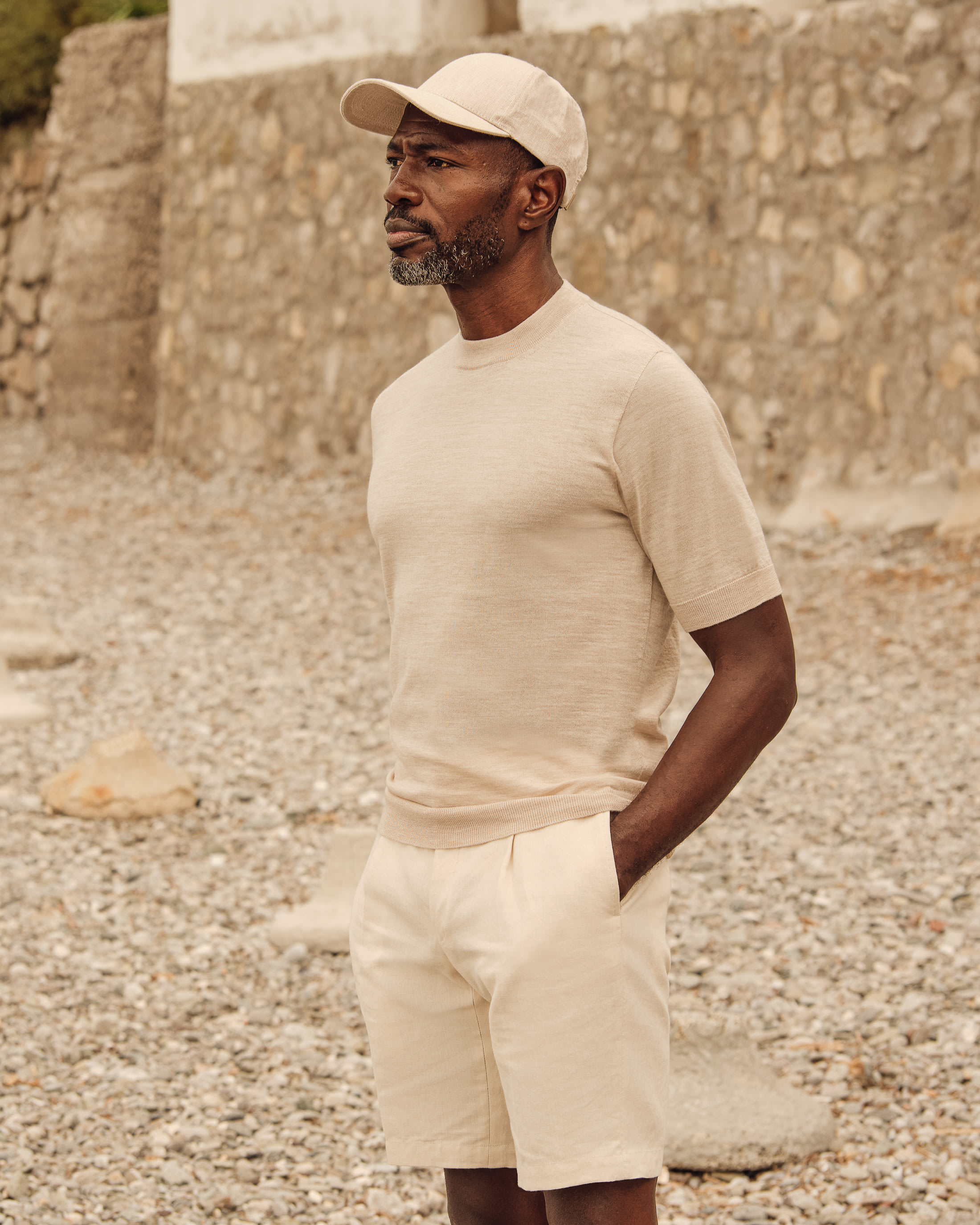 Intentional daytime dressing in a sandy palette for the very height of summer. Switch out your classic tee this season for a breathable crew neck knit crafted from the finest merino wool. To take it to the beach, simply pair with these pleated linen Bermudas and a minimalist cap in a matching muted hue.