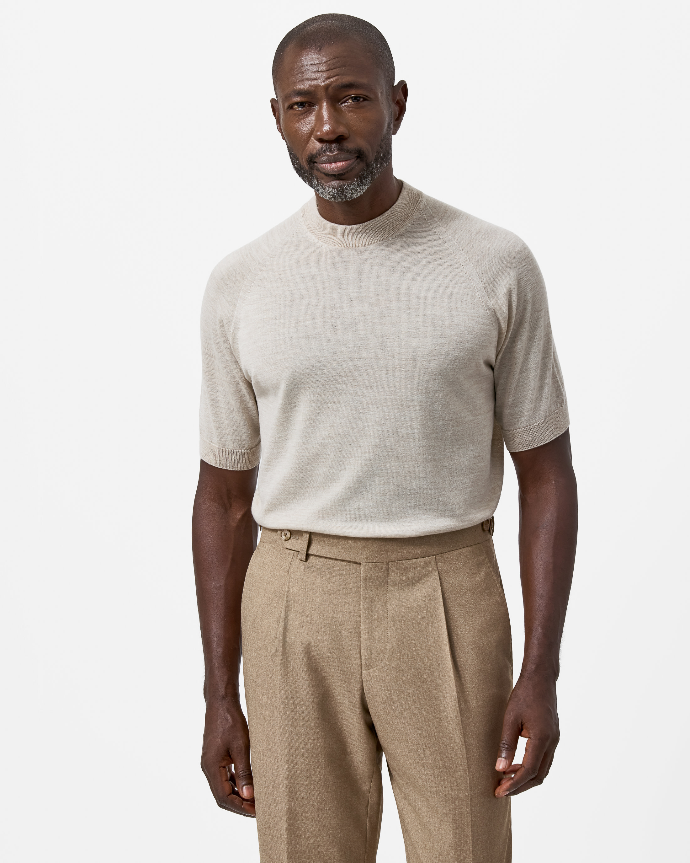 This sandy-hued knit is breathable and truly a pleasure to wear. The S160 ultra-fine merino wool yarn, spun in Italy by the masters at Loro Piana, rivals the softness of high-quality cashmere. Crafted on demand by 3D knitting machines to avoid the stitched seams typical of mass production, creating a sleeker, more luxurious look. Designed here as a short-sleeved crew neck in single-ply yarn, perfect for staying cool in summer or lightweight layering year round.