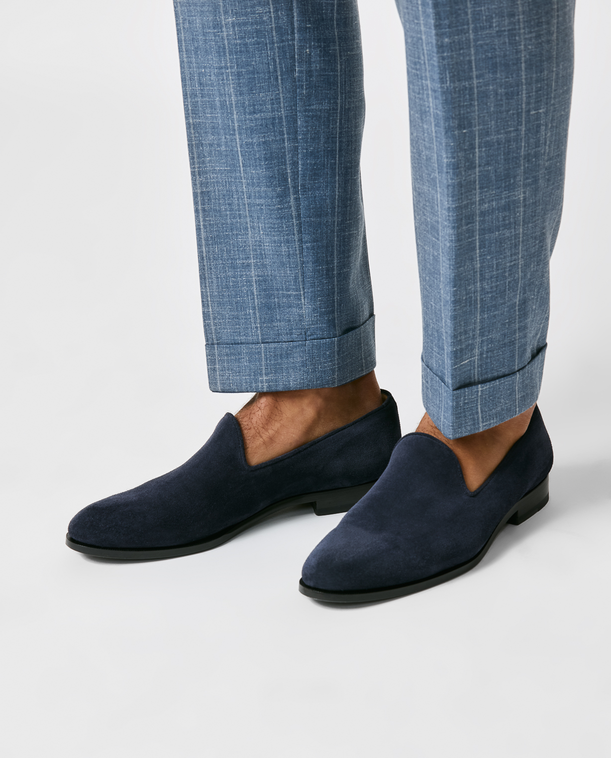 These handmade loafers in midnight dark blue loafers are a comfortable option for styling. The light suede is made from flexible chrome-tanned calfskin with a short nap for a touch of softness. Make these shoes your own with our many customization options to choose from.