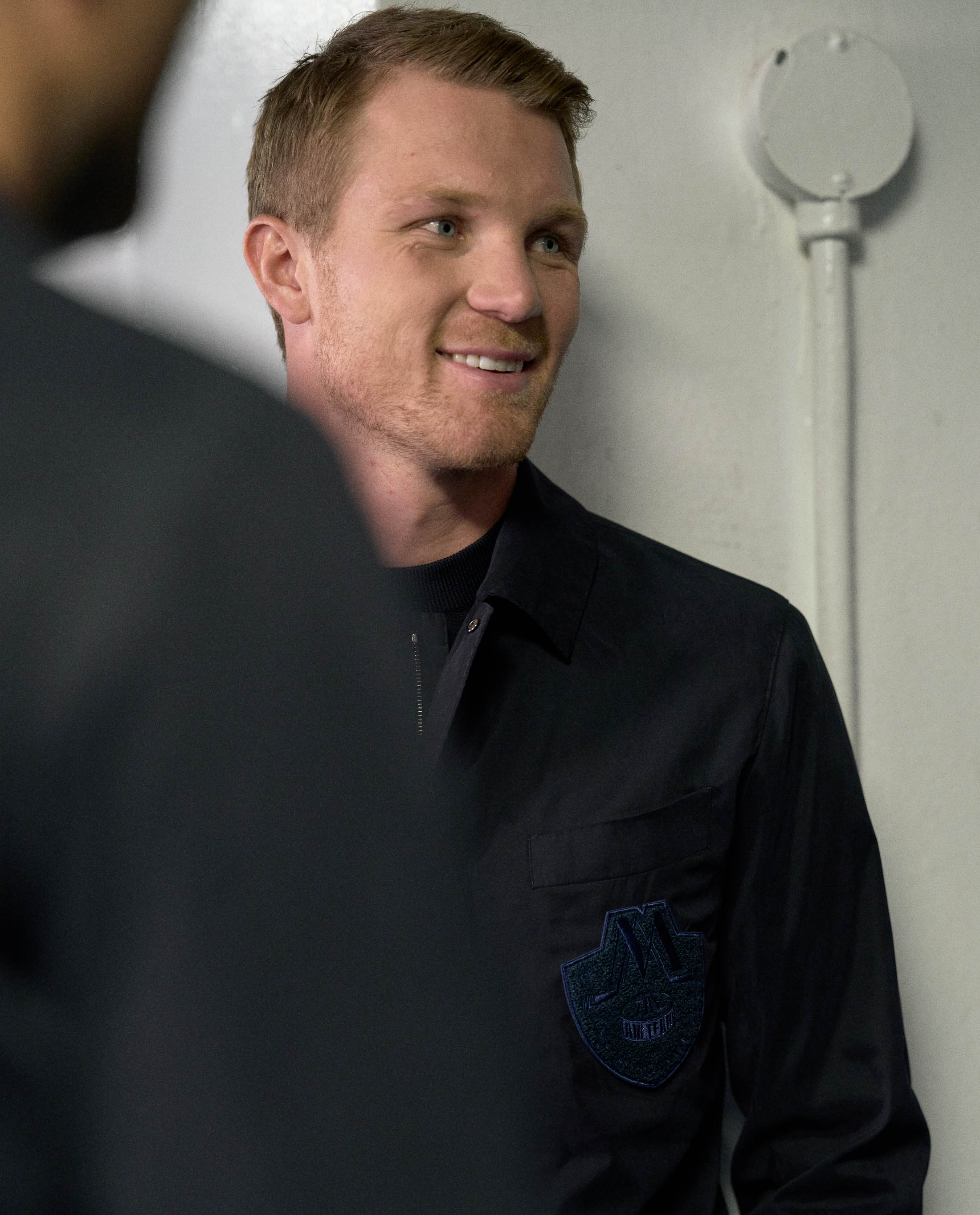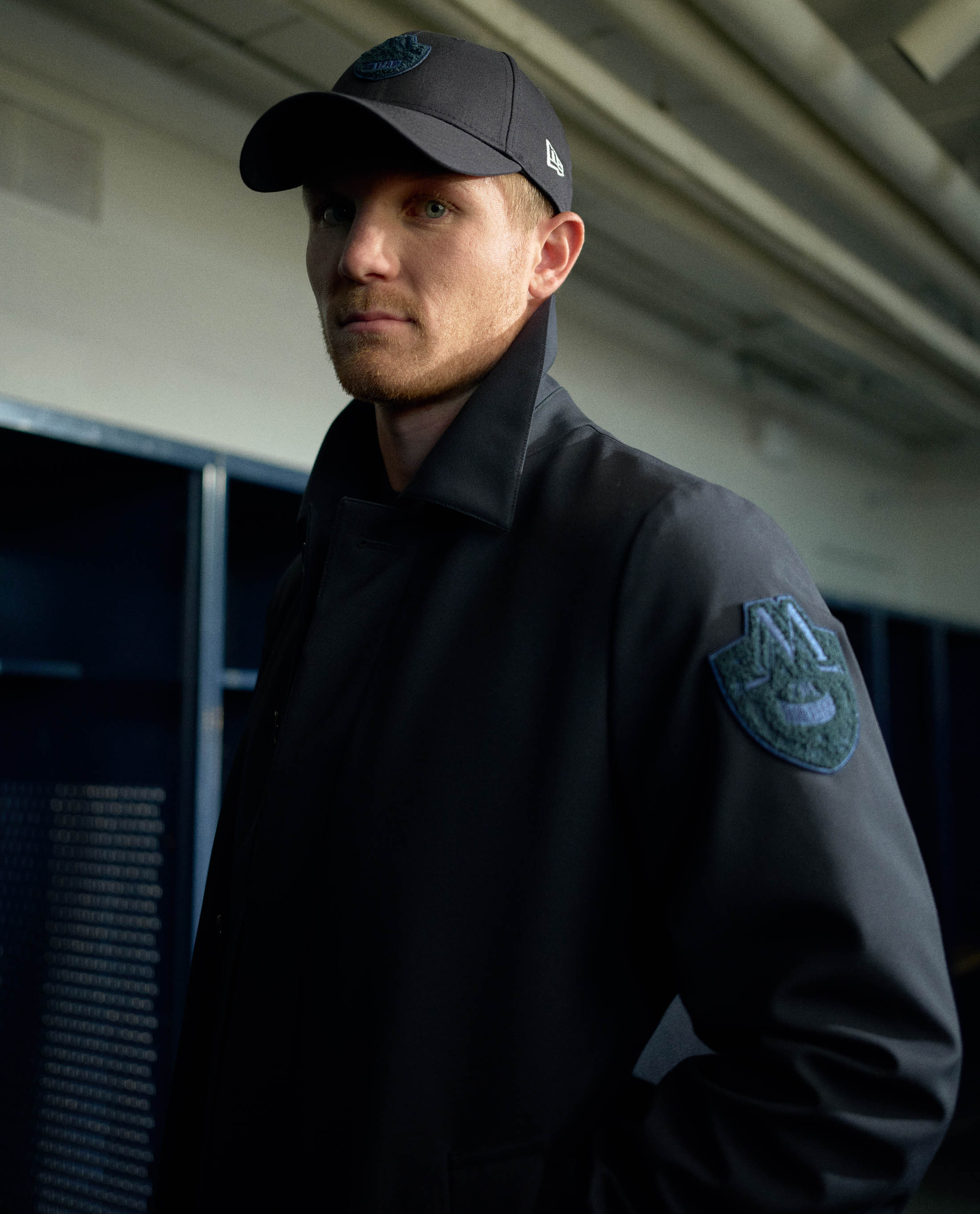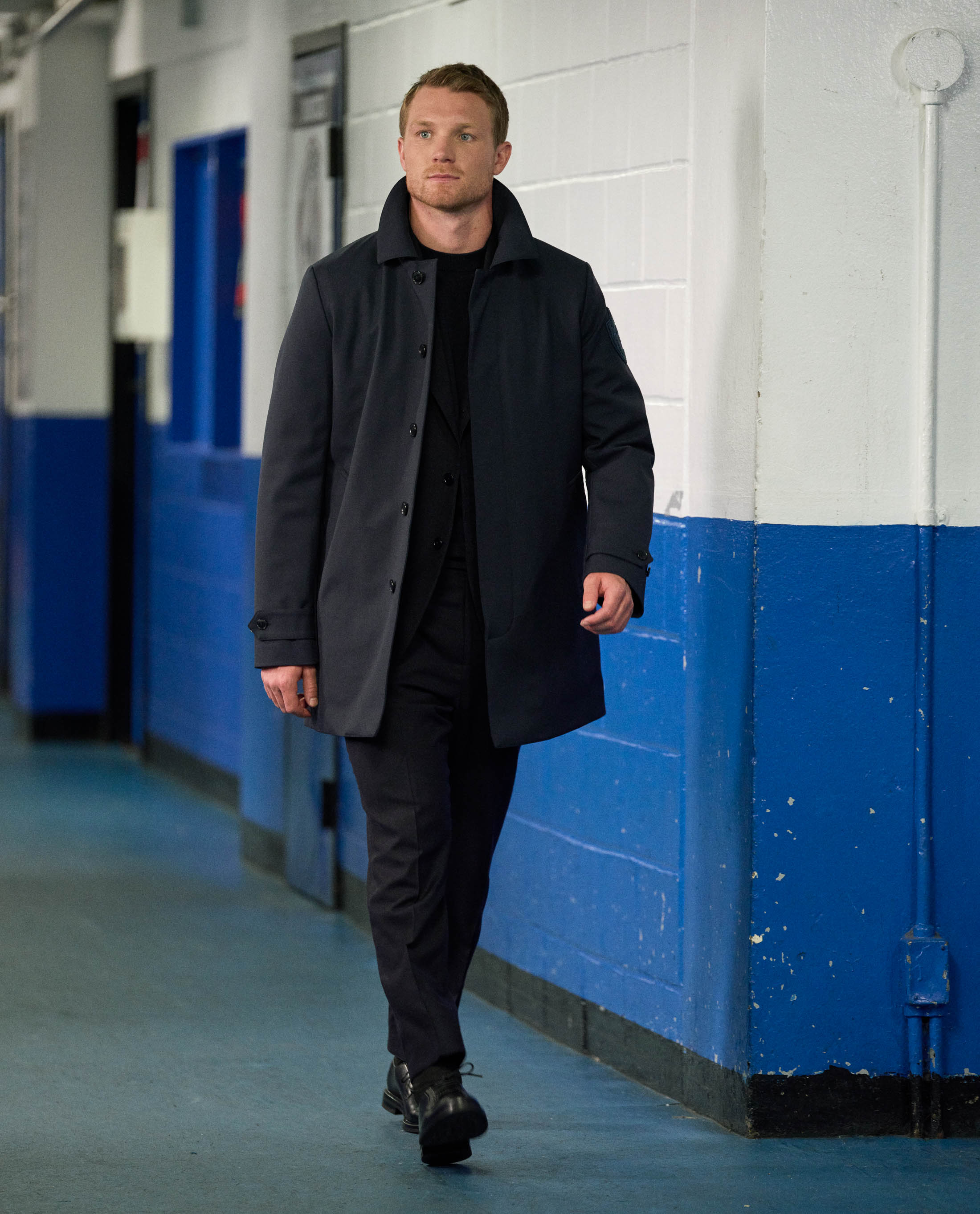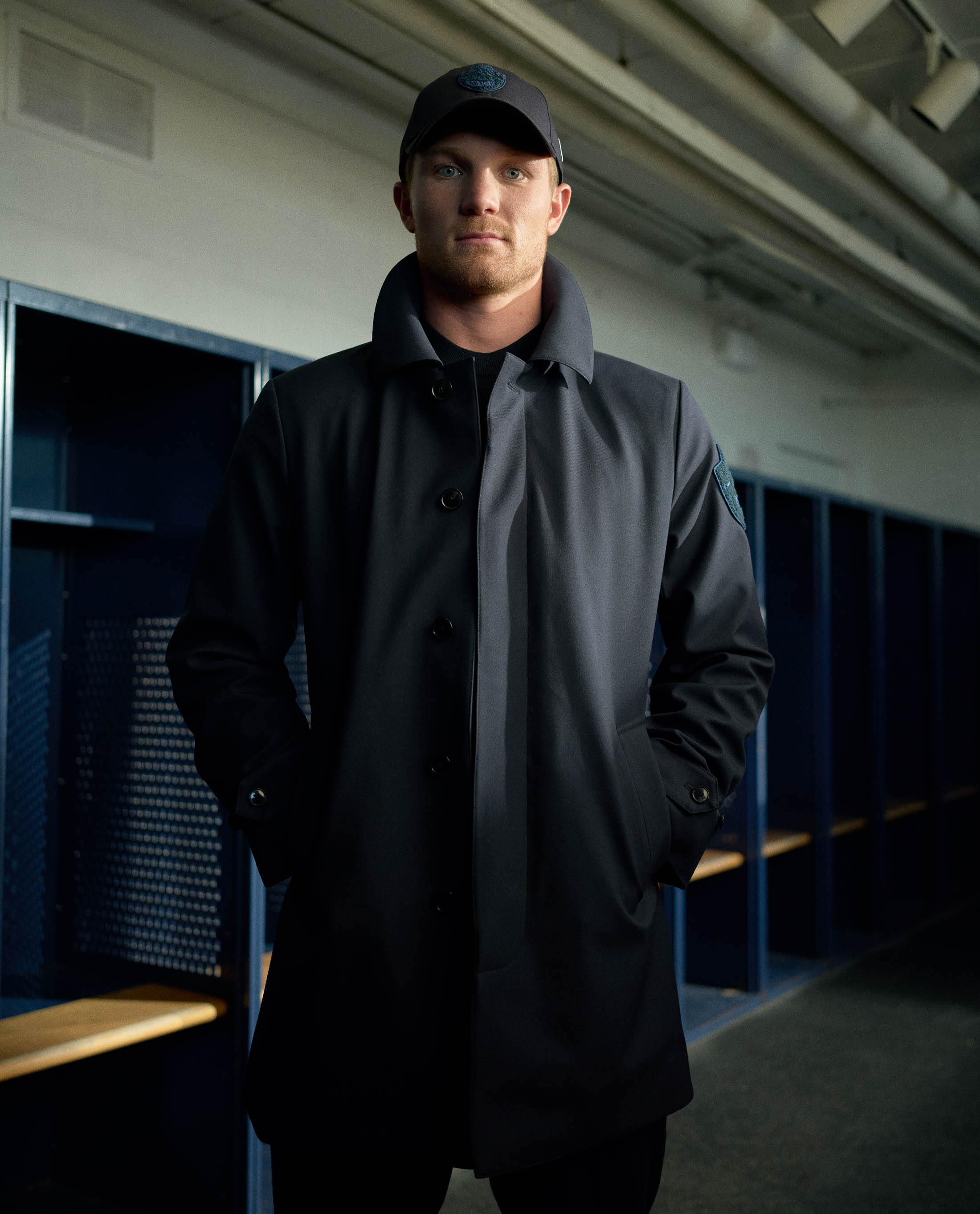 Ty Dallandrea nails the head-to-toe dark blue look with his pre-game tunnel fit, including a chic, dark blue coat with plenty of practical water repellence thanks to its refined Storm System® wool fabric made in Italy by Loro Piana. Underneath: a soft midnight blue stretch suit, wool crew neck knit, and sleek black Bluchers.