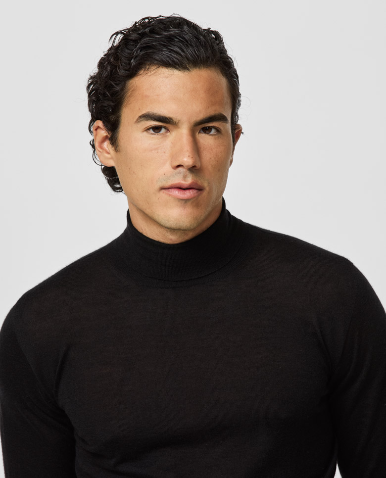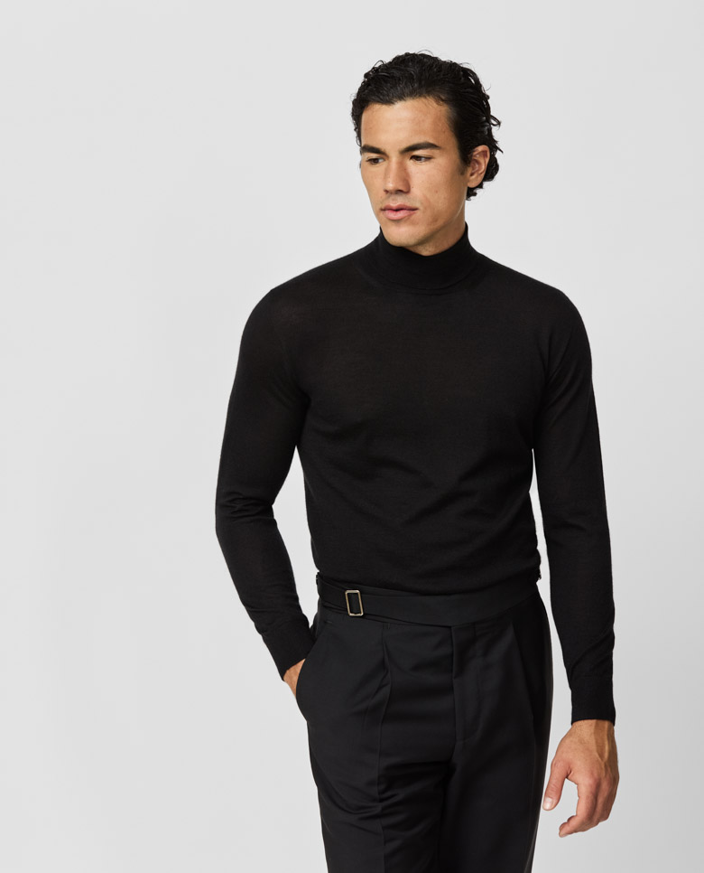 This black knit will keep you cool in summer and warm enough in winter. The high-quality blend combines the drape and shine of silk with luxurious cashmere. Crafted on 3D-knitting machines for a sophisticated seamless look. Designed here as a turtleneck, in single ply for a lighter wear. Make this knitwear your own with our customization options. Cashmere & silk Superior drape Shine Soft feel