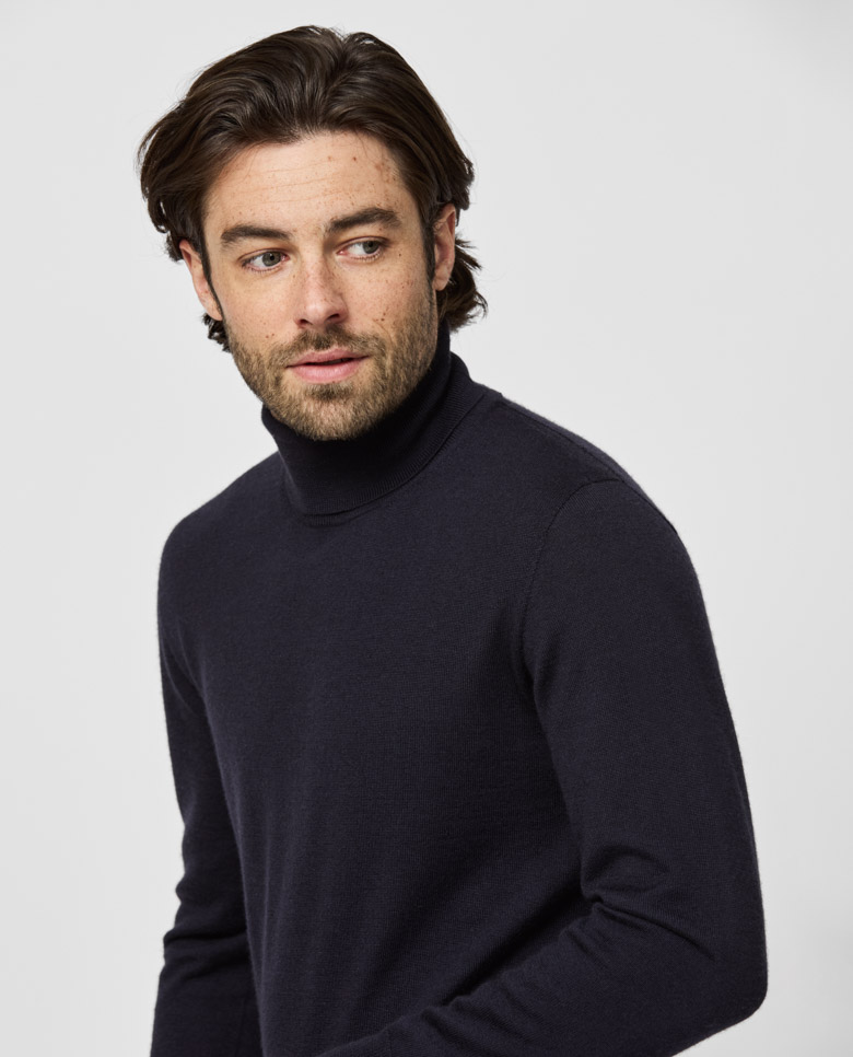 This midnight blue knit offers a luxurious layer with an element of lightness. The high-quality blend combines the drape and shine of silk with the softness of cashmere. Crafted on 3D-knitting machines for a sophisticated seamless look. Designed here as a turtleneck, in double ply for extra body. Make this knitwear your own with our customization options. Cashmere & silk Superior drape Shine Soft feel