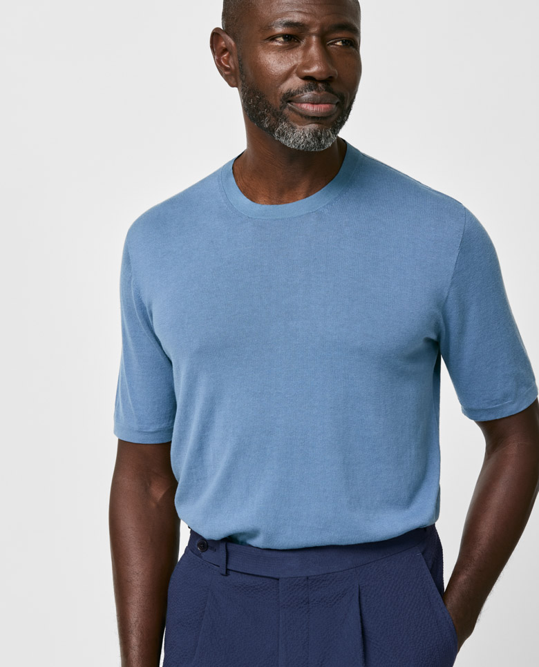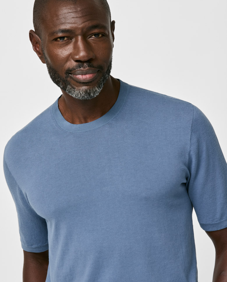 Lightweight with shine especially visible in the sunlight, consider this denim blue t-shirt your quintessential summer knit. Seamlessly knitted from a luxe blend of breathable Egyptian cotton with mulberry silk, adding even more elegance, softness, and drape. Make this knitwear your own with our customization options.