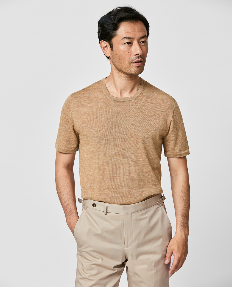 This camel knit is a comfortable addition to your year-round wardrobe. The extra-fine merino wool is 3D knitted for a luxurious seamless look. Designed here as a crew neck with short sleeves, made from single yarns for a lighter wear. Make this knit your own with our many customization options to choose from.