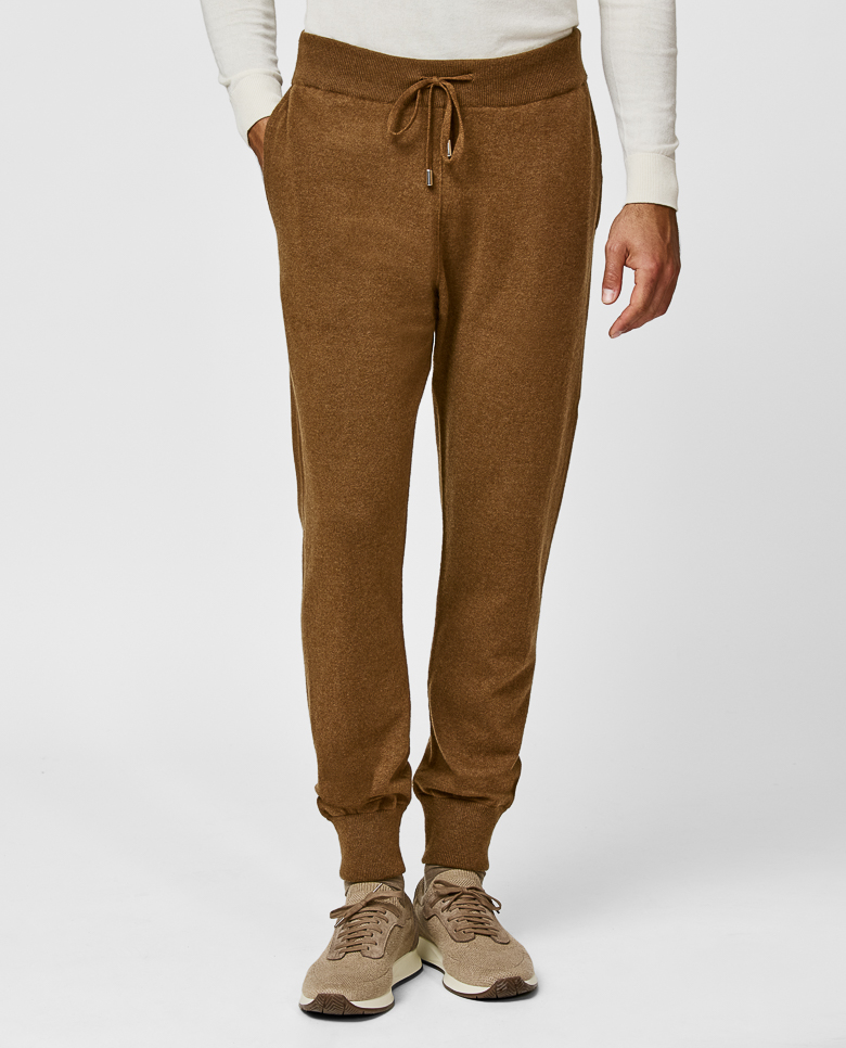 Lounge in luxury with these knitted leisure pants in cinnamon. Made from pure cashmere for a soft, super comfy feel with superior warmth. Featuring an airy fit with elastic drawstring waistband. Designed here with a right back pocket, in single ply for a lighter wear. Make this knitwear your own with our customization options.