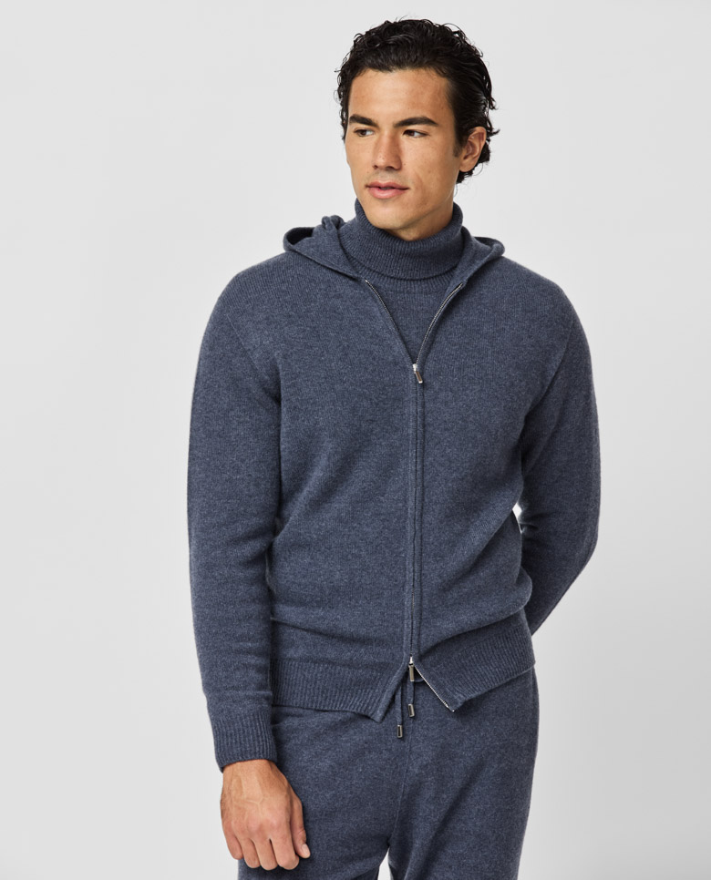 A luxurious denim blue knit with an elevated seamless look. Made from pure cashmere for a soft feel with superior warmth. Designed here as a hoodie with a zip, in single yarns for a lighter wear. Make this knitwear your own with our many customization options to choose from. 100% cashmere Lightweight warmth Breathable Soft feel