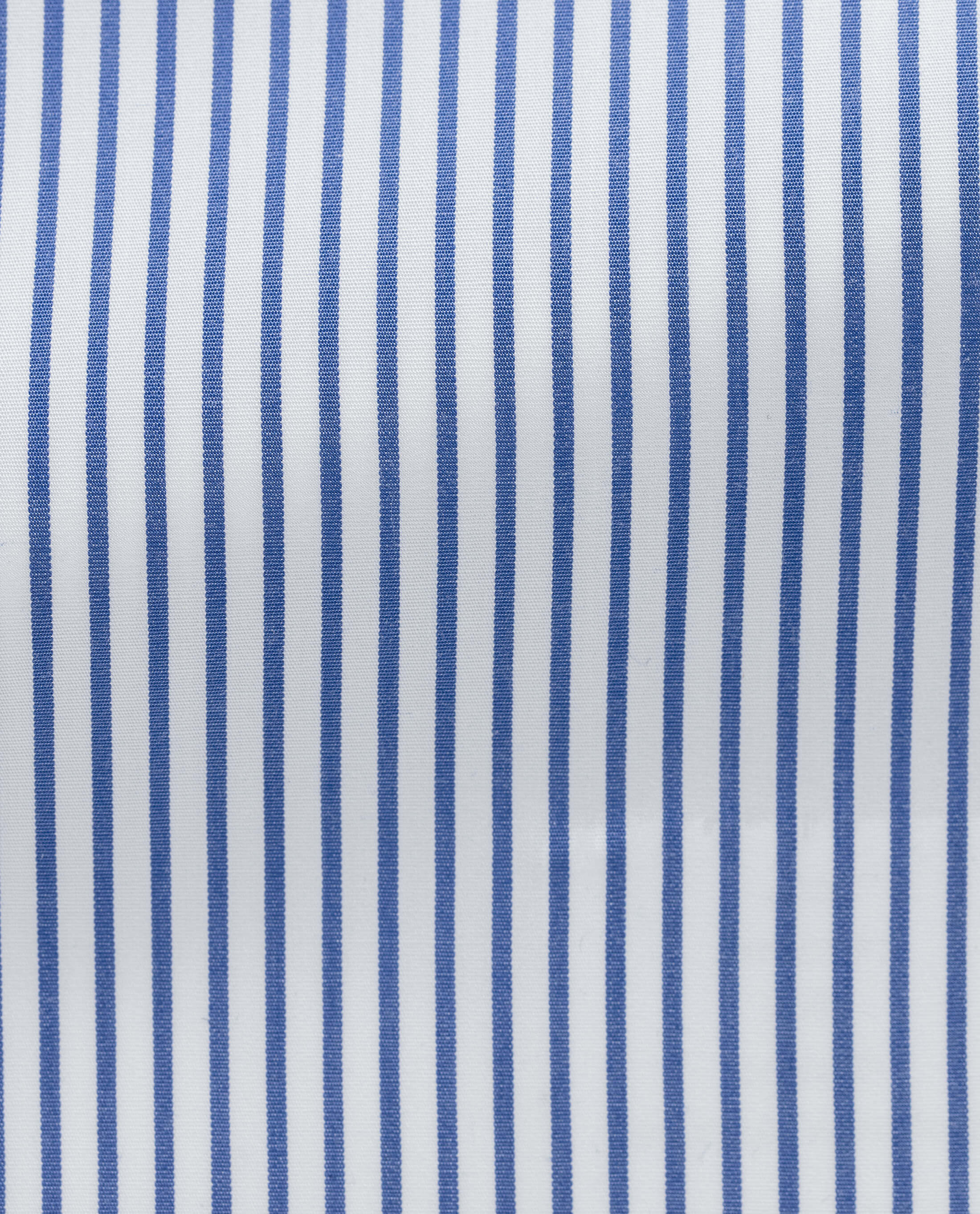 Arrive in classic style with this blue striped business shirt. With its soft touch, this cotton poplin made from fine single yarns is a pleasure to wear. Designed here with mother of pearl buttons and a cutaway collar. Make this shirt your own with our many customization options to choose from.