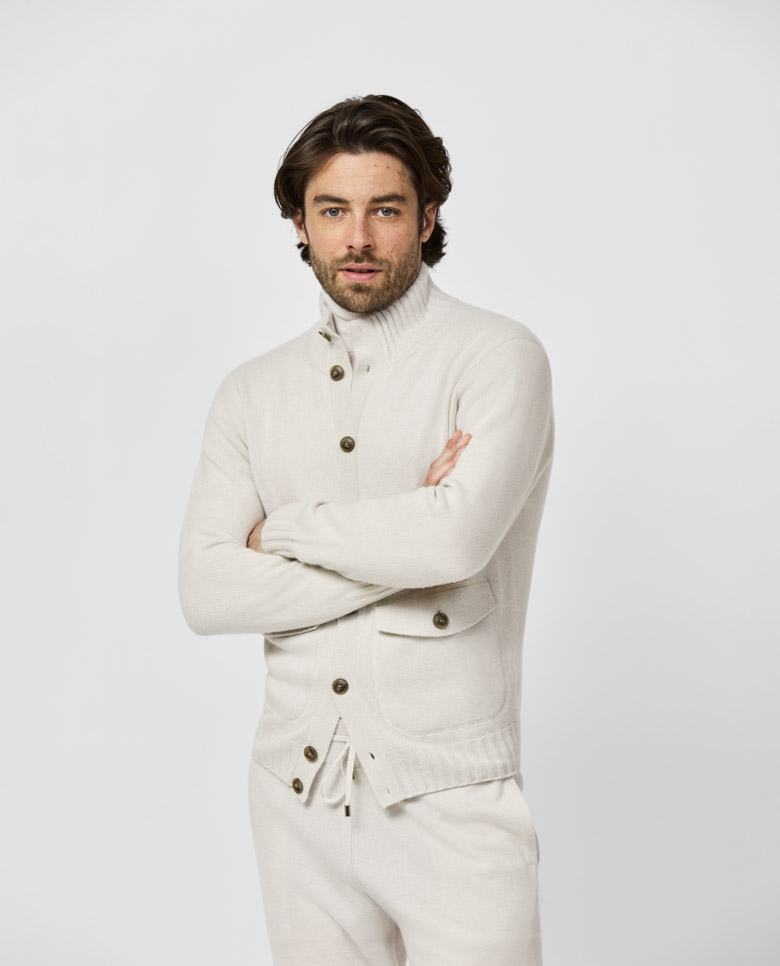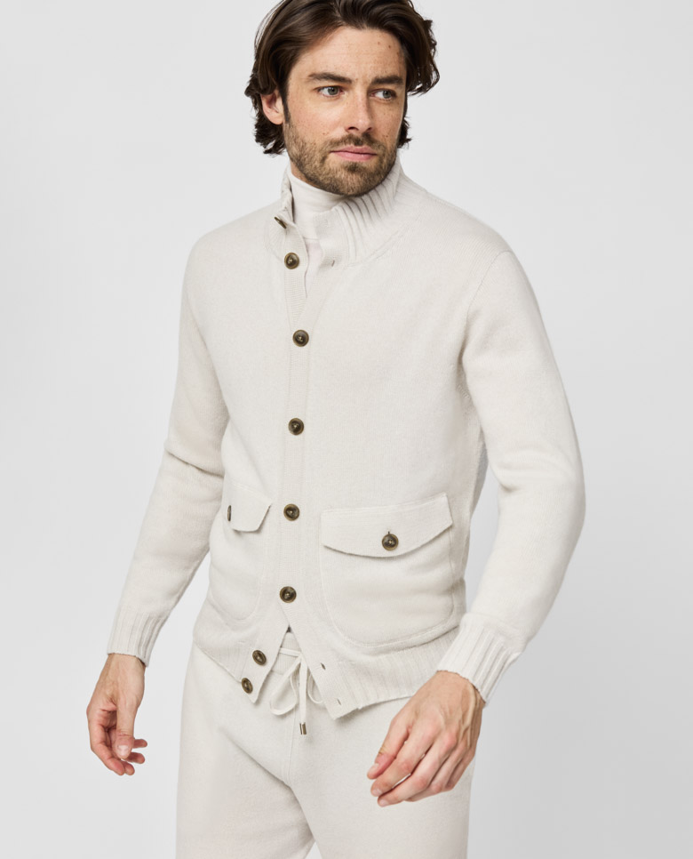 With its side pockets and chunky ribbed finishing, this greige knit is casual meets practical. Made from soft cashmere with superior insulation and 3D knitted for a luxurious seamless look. Designed here as a bomber knit with full-length buttons, in double ply for winter warmth. Make this knitwear your own from our customization options. 100% cashmere Lightweight warmth Breathable Soft feel
