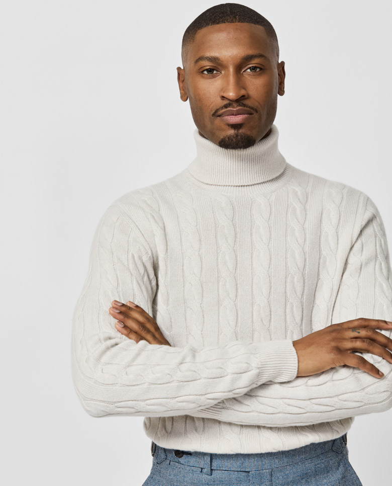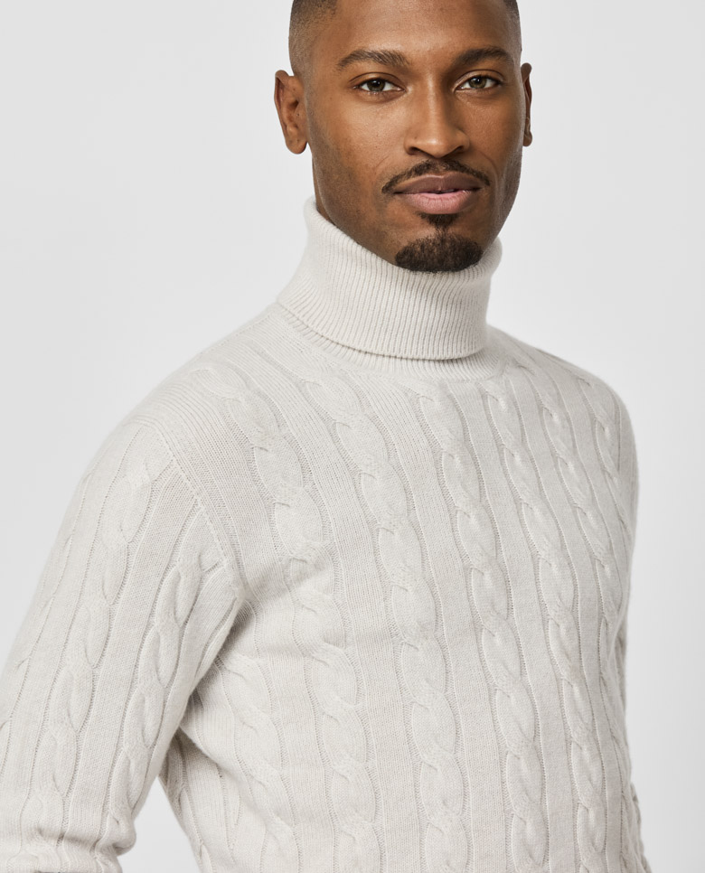 Nothing radiates casual refinement like this greige cable knit. Made from soft cashmere with superior insulation, 3D-knitted for a luxurious seamless look. Designed here as a turtleneck for a classic winter look. Make this knitwear your own with our customization options. 100% cashmere Lightweight warmth Breathable Soft feel