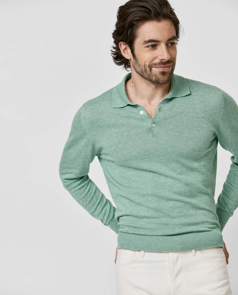 This light sage green knit is summer friendly with a seamless finish. Crafted from a blend of breathable Turkish cotton and soft Inner Mongolian cashmere. Designed here as a classic polo, in single ply for a lightweight look. Make this knitwear your own with our many customization options to choose from. Cotton & cashmere Breathable Soft feel