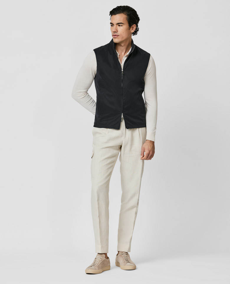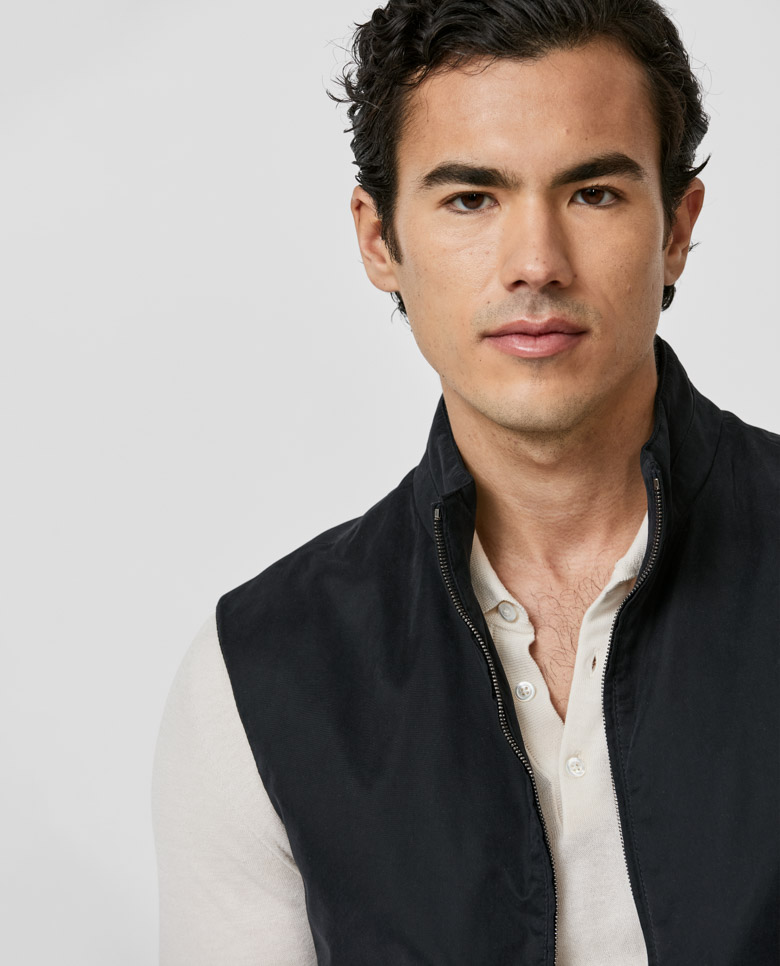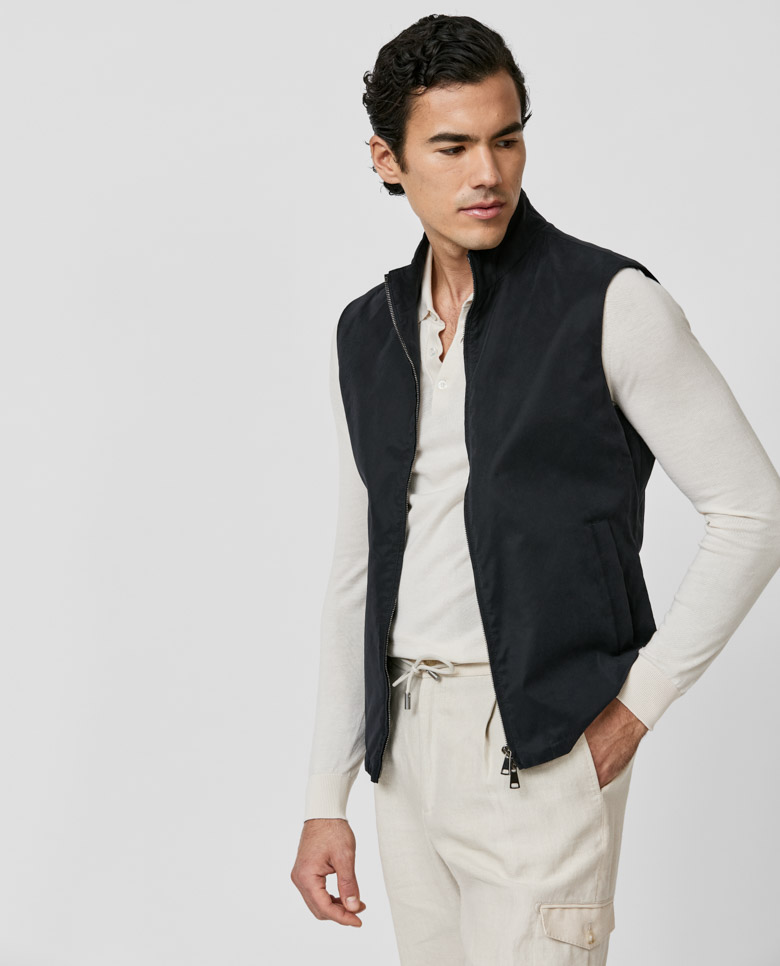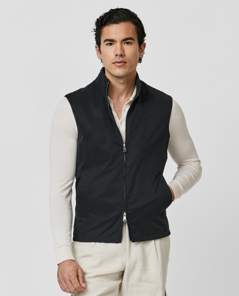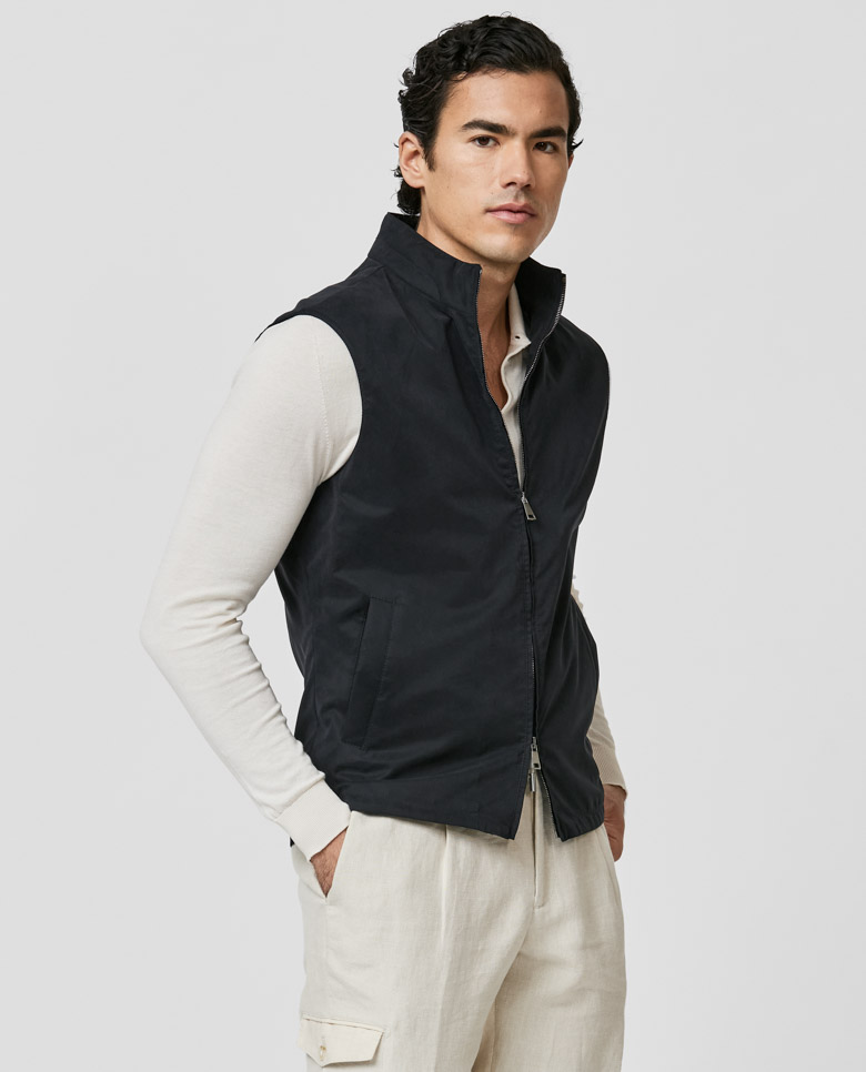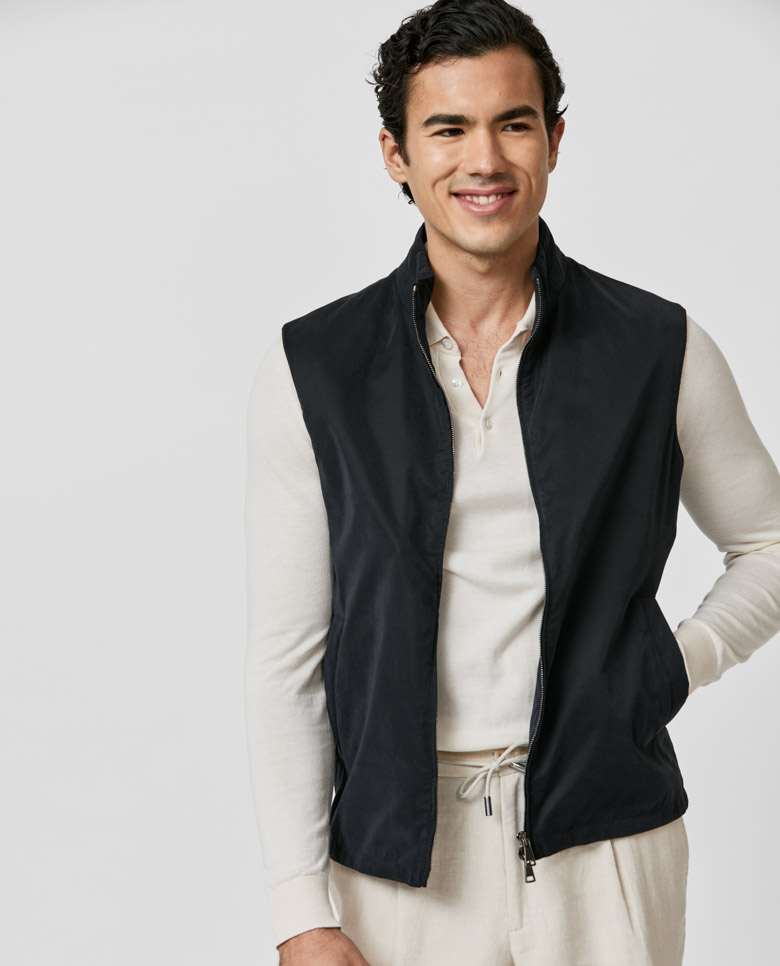 For a laidback look with sportive style, throw on this lightweight midnight blue vest. Made from a technical fabric featuring a velvety texture and water-repellent finish. Designed here with a two-way zip closure. Pair it for weekends with a polo knit, linen cargo pants, and suede sneakers. Make this vest your own with our many customization options to choose from.
