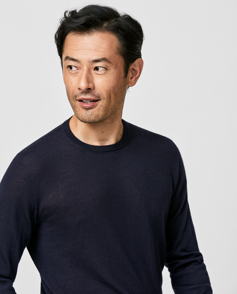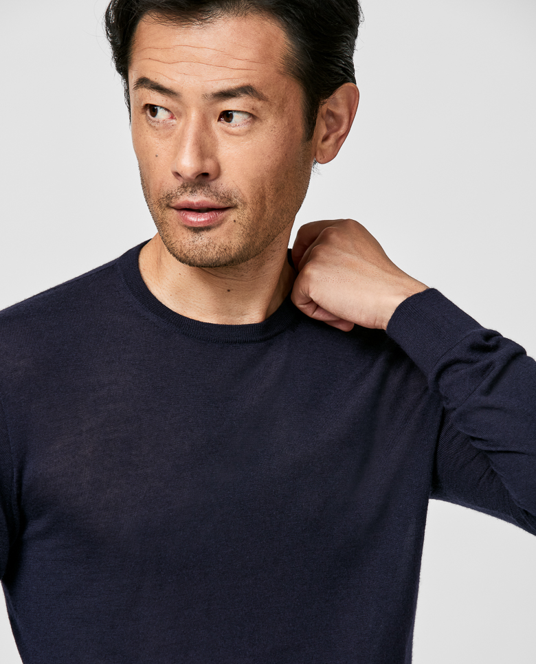 This navy blue knit offers a luxurious layer with an element of lightness. The high-quality blend combines the drape and shine of silk with the softness of cashmere. Crafted on 3D-knitting machines for a sophisticated seamless look. Designed here as a crew neck, in double ply for extra body. Make this knitwear your own with our customization options. Cashmere & silk Superior drape Shine Soft feel