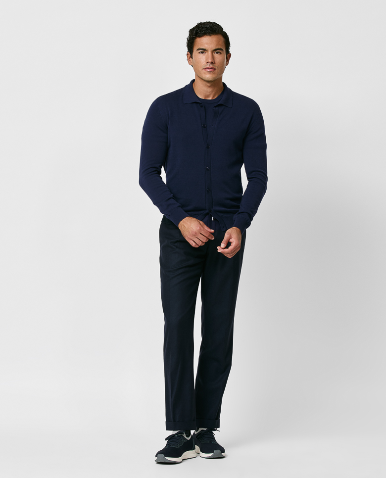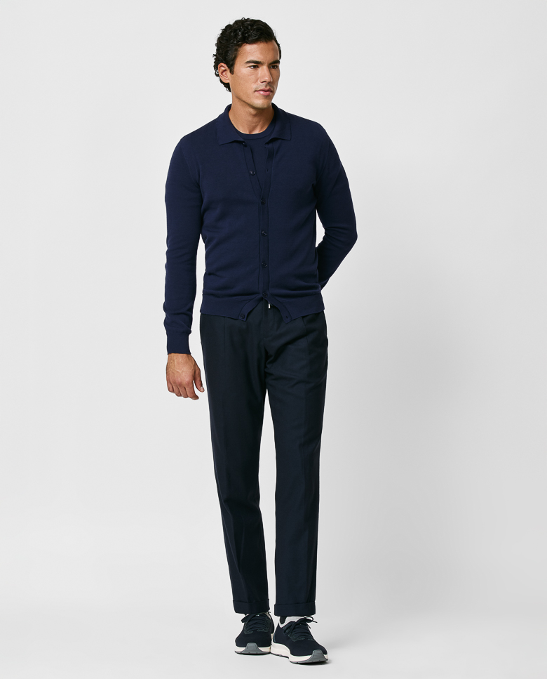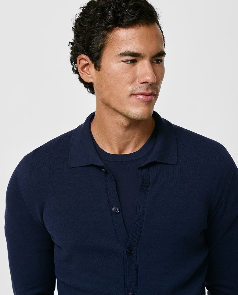 Lightweight with shine especially visible in the sunlight, consider this navy blue cardigan your quintessential summer knit. Seamlessly knitted from a luxe blend of breathable Egyptian cotton with mulberry silk, adding even more elegance, softness, and drape. Designed here as a cardigan with a polo collar and in double ply. Make this knitwear your own with our customization options.