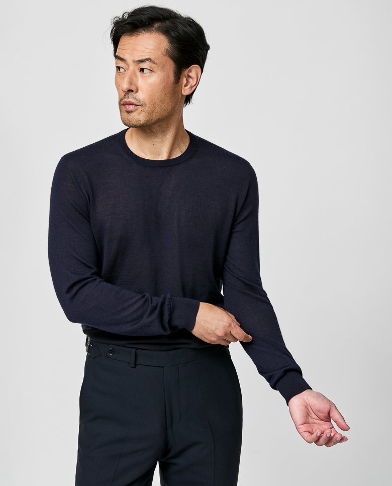 This navy blue knit offers a luxurious layer with an element of lightness. The high-quality blend combines the drape and shine of silk with the softness of cashmere. Crafted on 3D-knitting machines for a sophisticated seamless look. Designed here as a crew neck, in double ply for extra body. Make this knitwear your own with our customization options. Cashmere & silk Superior drape Shine Soft feel