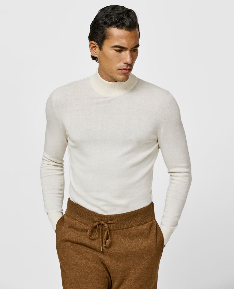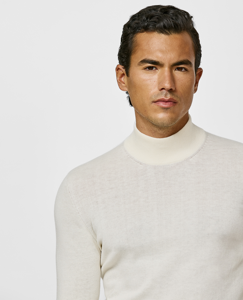 This seamless off-white knit is made for layering. Crafted on 3D knitting machines from a blend of breathable Turkish cotton and soft Inner Mongolian cashmere. Designed here with a turtle neck, in single ply for a lighter wear. Make this knitwear your own from our customization options.