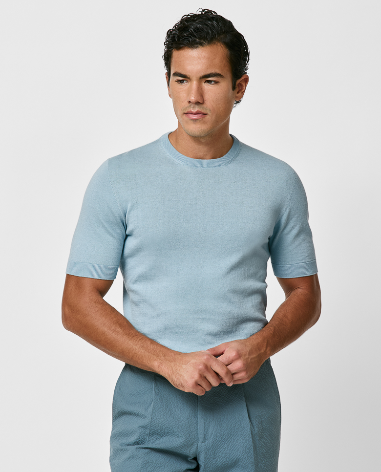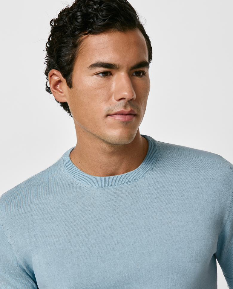 This sky blue knit is summer friendly with a seamless finish. Crafted from a blend of breathable Turkish cotton and soft Inner Mongolian cashmere. Designed here with a slim crew neck, in single ply for a lightweight look. Make this knitwear your own with our many customization options to choose from. Cotton & cashmere Breathable Soft feel