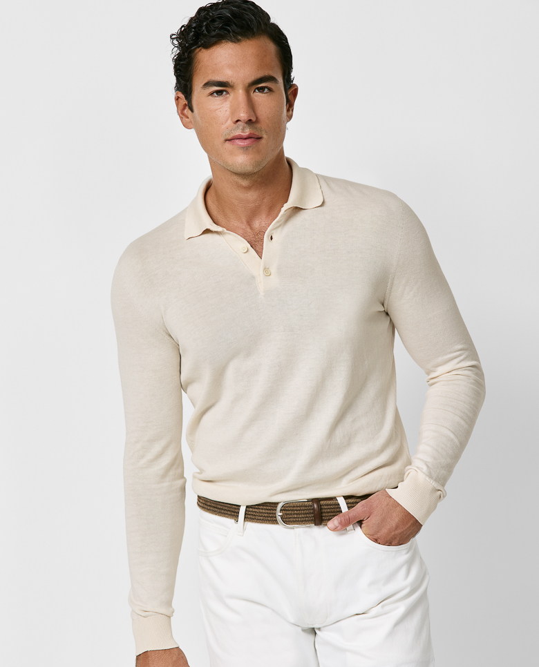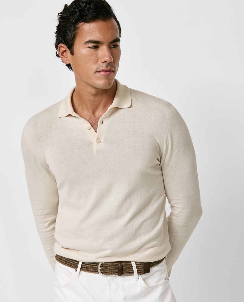 Lightweight with shine especially visible in the sunlight, consider this off-white polo your quintessential summer knit. Seamlessly knitted from a luxe blend of breathable Egyptian cotton with mulberry silk, adding even more elegance, softness, and drape. Designed here in single ply for the lightest wear possible. Make this knitwear your own with our customization options. Cotton & silk Lightweight Breathable Subtle shine Soft feel