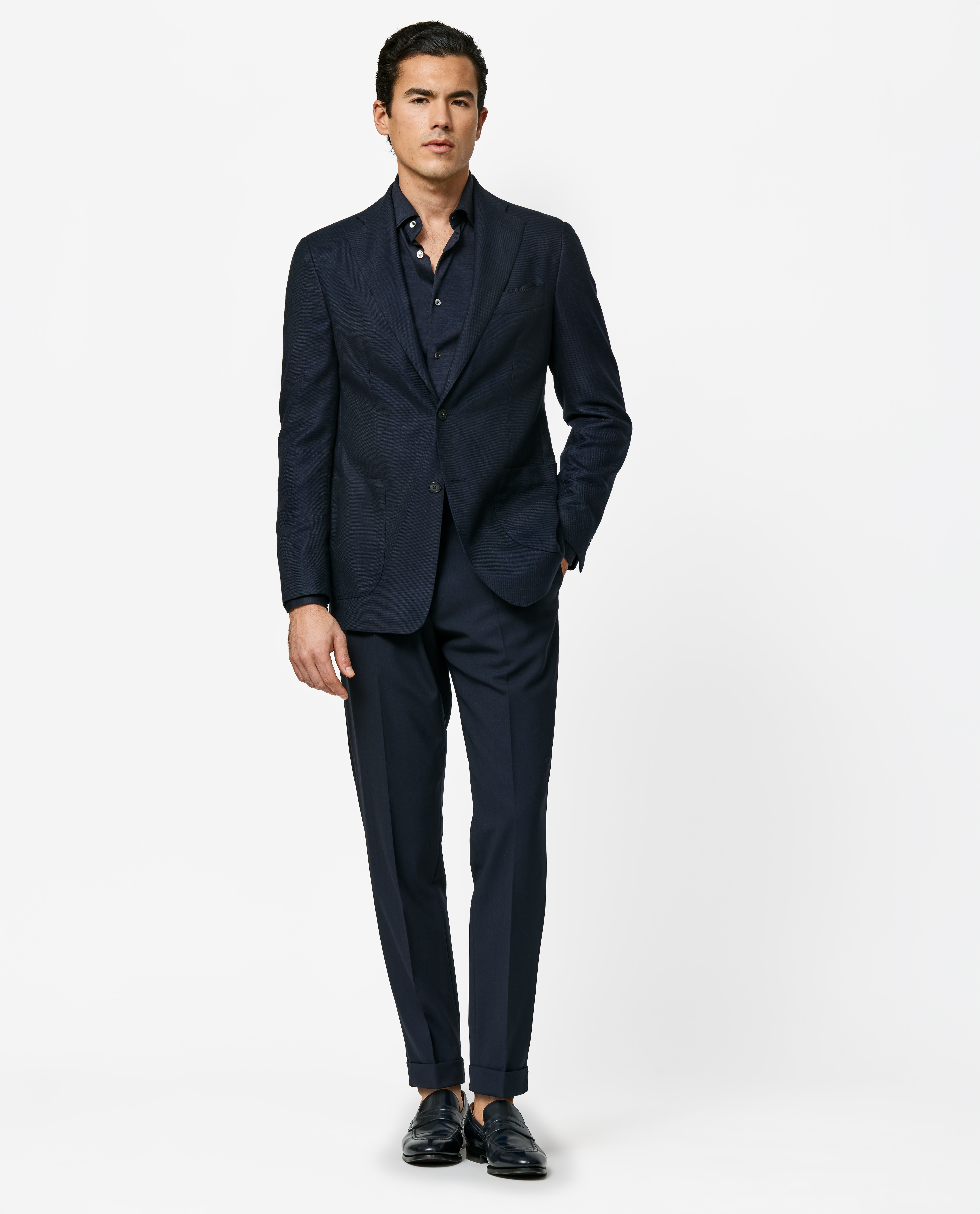 Designed for an effortlessly refined look, this jacket is crafted from a luxurious silk-wool blend that offers both softness and a subtle sheen. The unconstructed design with a half lining ensures lightweight comfort, while the two-button closure and patch pockets add a modern touch. This versatile piece is perfect for those seeking a balance of casual elegance and premium craftsmanship.