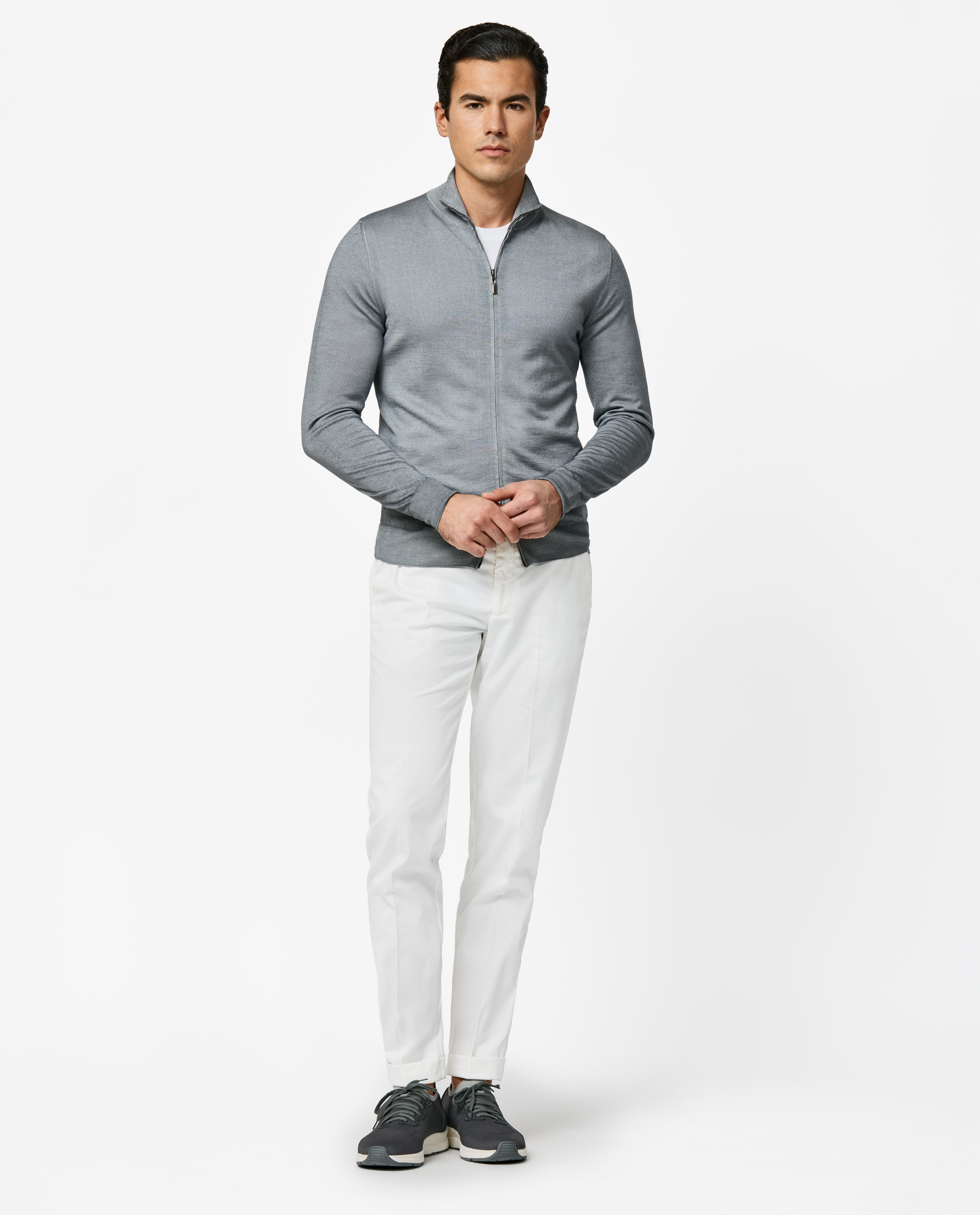 This full-zip cardigan is crafted from a luxurious blend of wool and silk, offering unparalleled softness and warmth. The full-zip design makes it easy to layer, while the tailored fit ensures a sleek silhouette. Perfect for elevating your casual wardrobe with a touch of refinement.