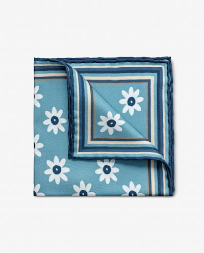 Add a touch of 70s-inspired charm to your ensemble with this white-on-blue floral pocket square. Printed on elegant pure silk in Como, Italy and finished with hand-rolled navy blue edges. Make this pocket square your own with a custom monogram in block or calligraphy letters. 100% silk Twill weave 33 x 33 cm Hand-rolled edges
