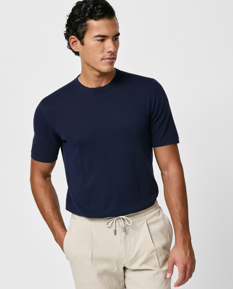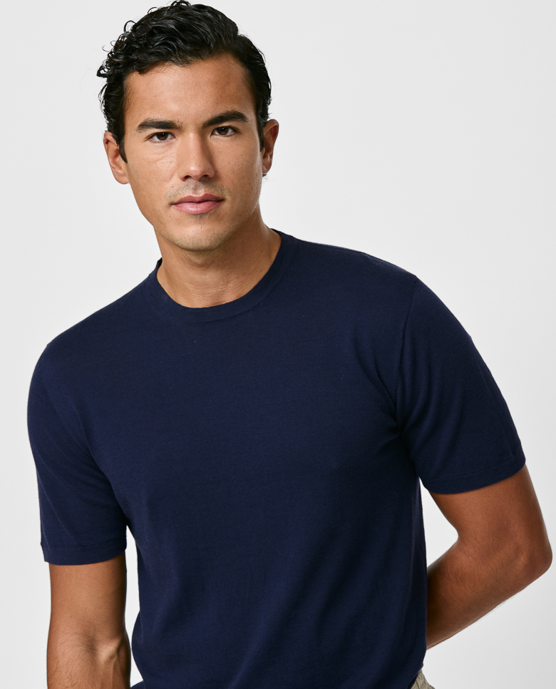 Lightweight with shine especially visible in the sunlight, consider this navy blue polo your quintessential summer knit. Seamlessly knitted from a luxe blend of breathable Egyptian cotton with mulberry silk, adding even more elegance, softness, and drape. Designed here as a t-shirt with short sleeves, and in double ply. Make this knitwear your own with our customization options. Cotton & silk Lightweight Breathable Subtle shine Soft feel