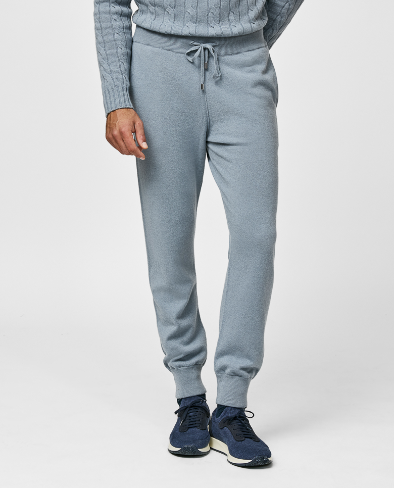 Lounge in luxury with these knitted leisure pants in steel blue. Made from pure cashmere for a soft, super comfy feel with superior warmth. Featuring an airy fit with elastic drawstring waistband. Designed here with a right back pocket, in single ply for a lighter wear. Make this knitwear your own with our customization options. 100% cashmere Lightweight warmth Breathable Soft feel