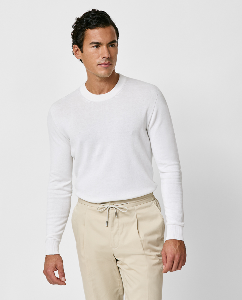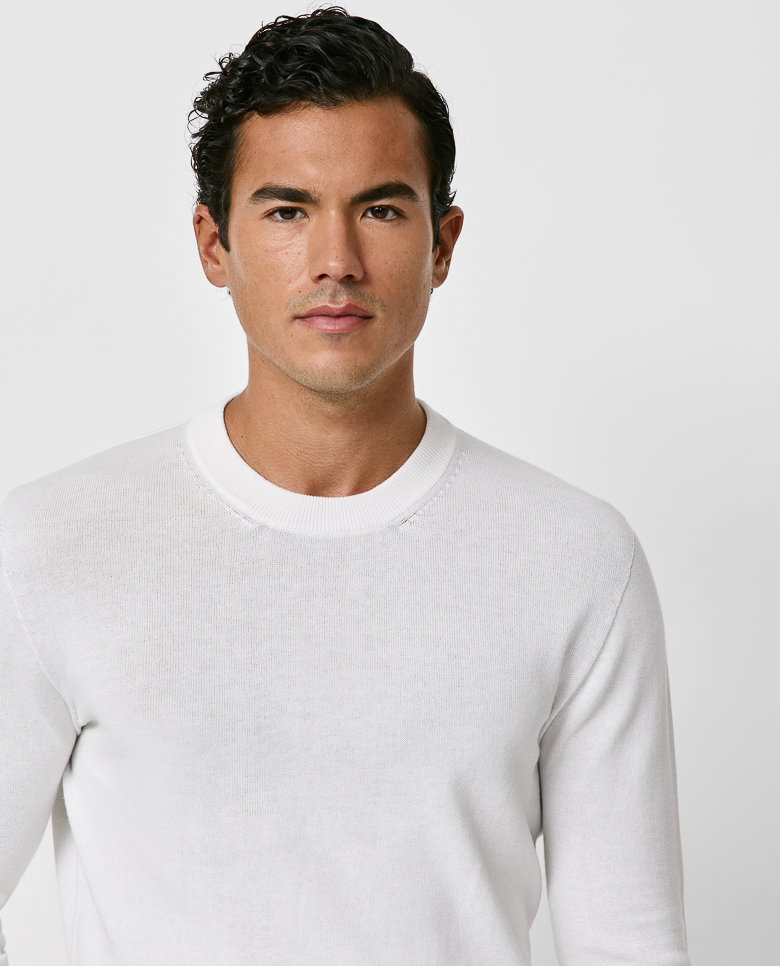 This white knit is summer friendly with a seamless finish. Crafted from a blend of breathable Turkish cotton and soft Inner Mongolian cashmere. Designed here with a slim crew neck, in single ply for a lightweight look. Make this knitwear your own with our many customization options to choose from. Cotton & cashmere Breathable Soft feel